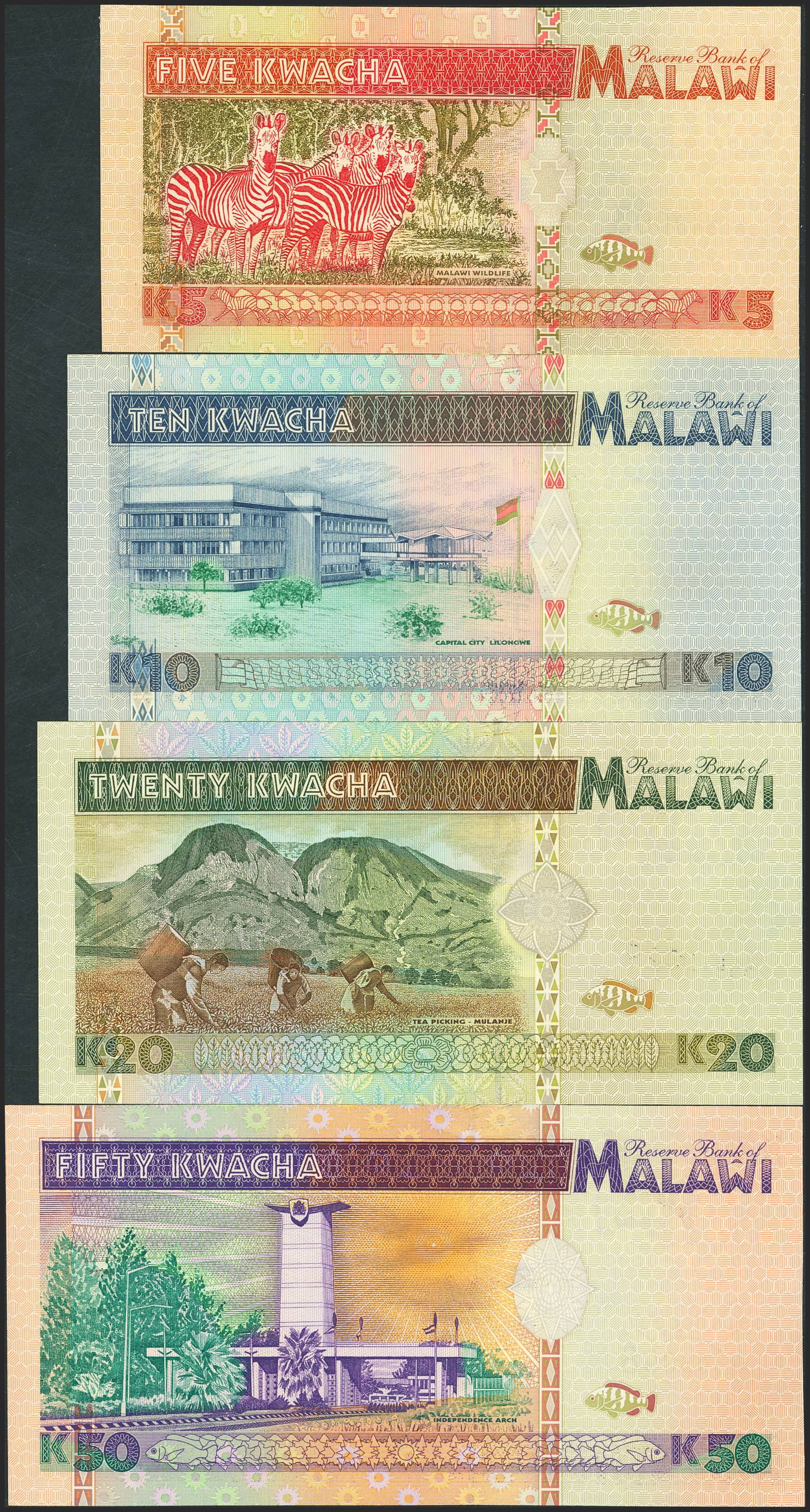 MALAWI. Lot of 4 notes of 5 Kwacha, 10 Kwacha, 20 Kwacha and 50 Kwacha. 1995. Reserve Bank of Malawi. (Pick: 30, 31, 32, 33). Uncirculated.