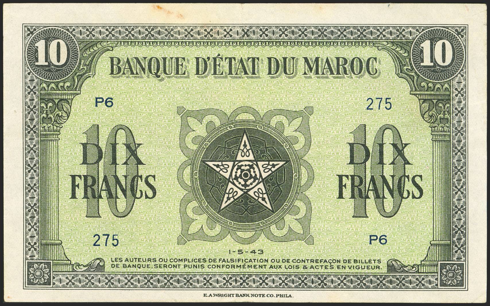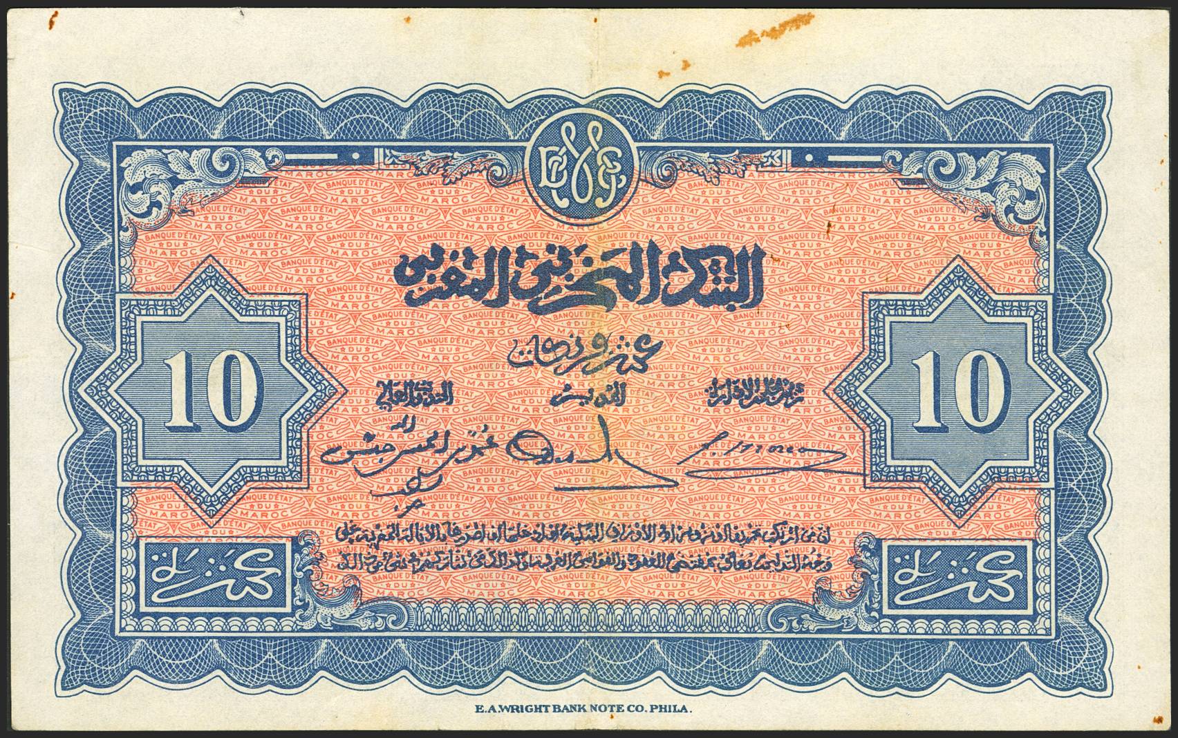MOROCCO. 10 Francs. 1 May 1943. Banque de Etat du Maroc. (Pick: 25). Stains. Very Fine.