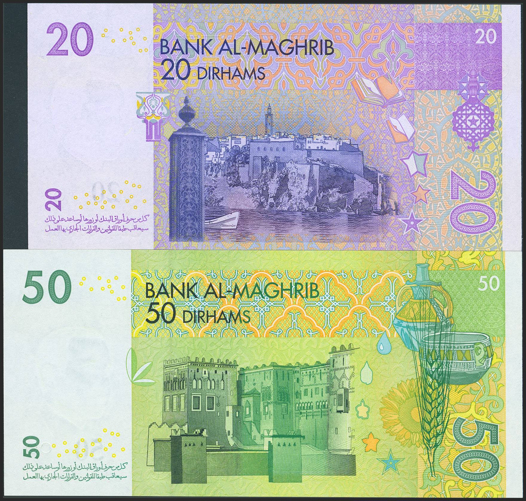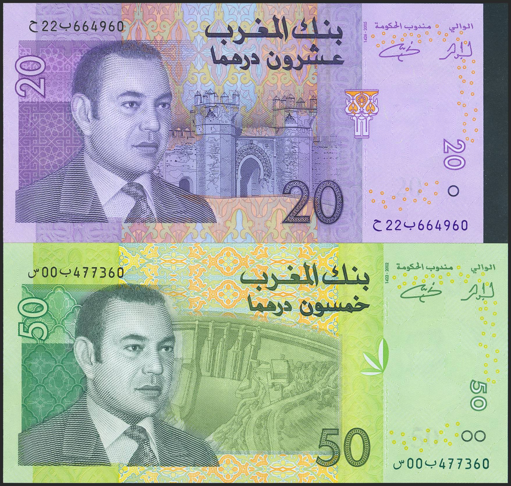 MOROCCO. Lot of 2 notes of 20 Dirhams and 50 Dirhams. 2005. Bank Al-Maghrib. (Pick: 68, 69a). Uncirculated.