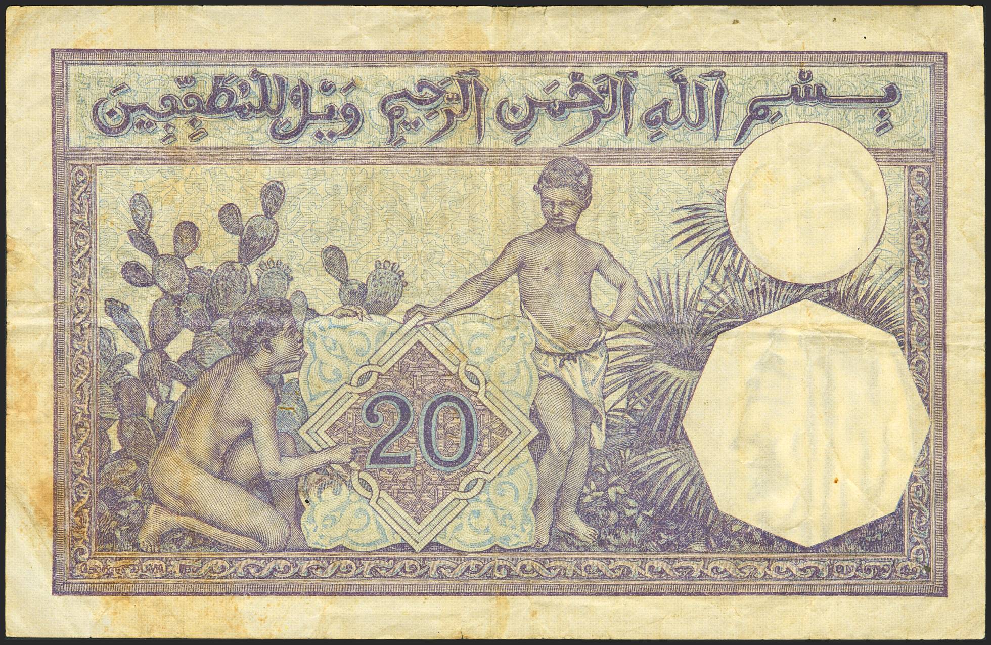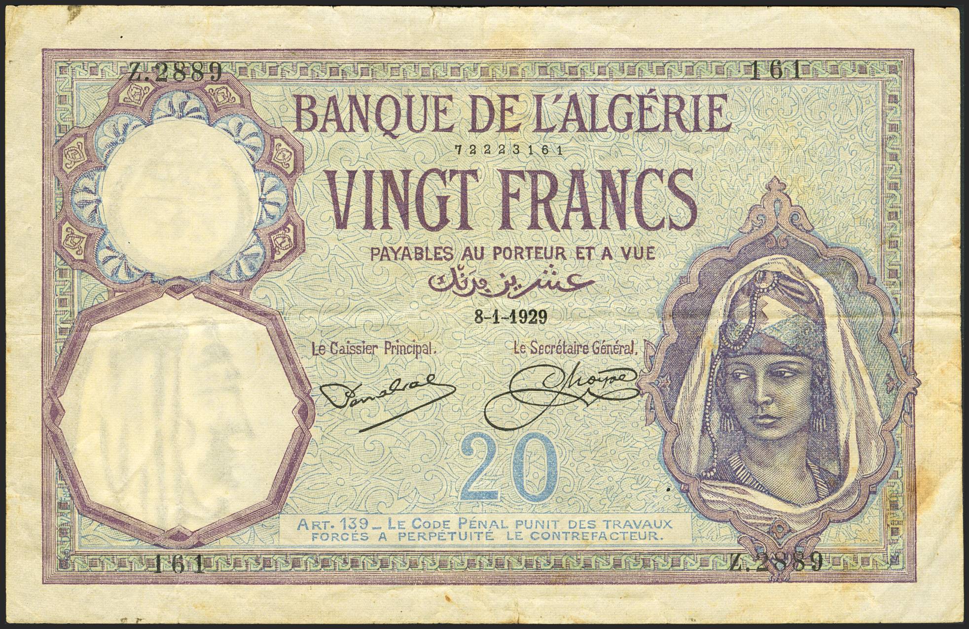 ALGERIA. 20 Francs. 8 January 1929. Banque de Algerie. (Pick: 78b). Closed pinholes. Less than Very Fine.