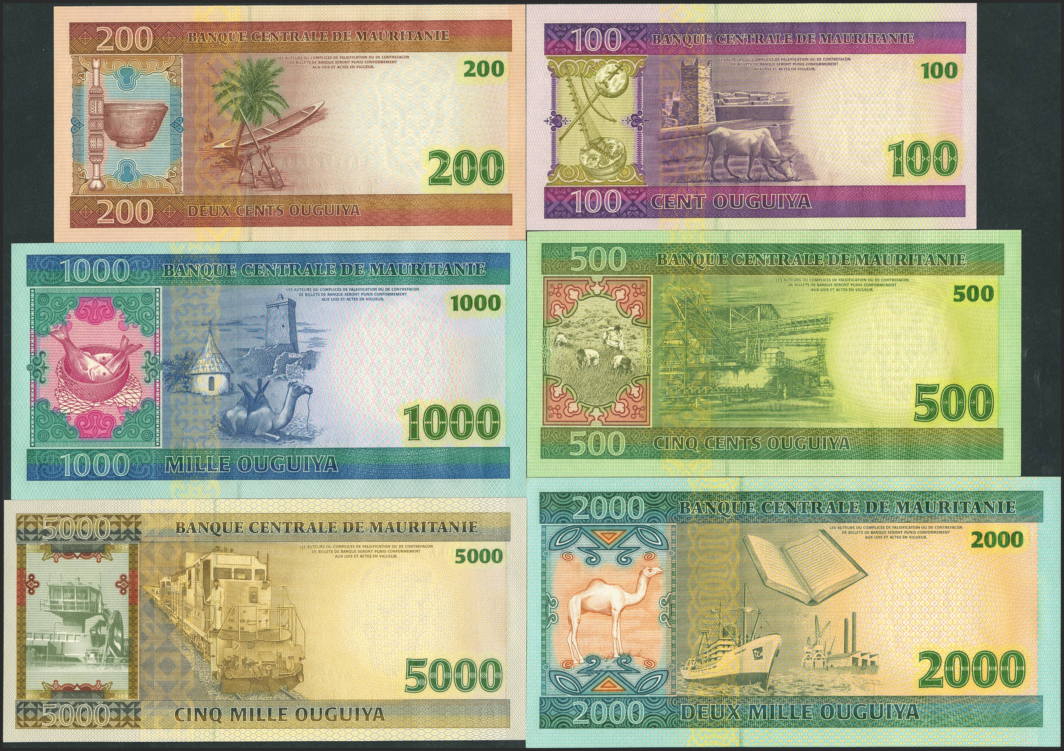MAURITANIA. Lot of 6 notes of 100 Ouguya, 200 Ouguya, 500 Ouguya, 1000 Ouguya, 2000 Ouguya and 5000 Ouguya. (2004ca). Banque Centrale. (Pick: 10a, 11a, 12a, 13a, 14a, 15). Uncirculated.
