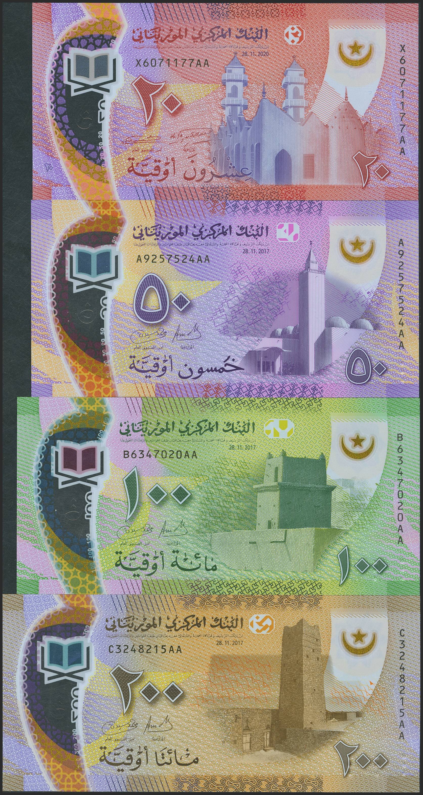 MAURITANIA. Lot of 4 notes of 20 Ouguya, 50 Ouguya, 100 Ouguya and 200 Ouguya. 2017. Banque Centrale. (Pick: A22, 22, 23, 24). Uncirculated.