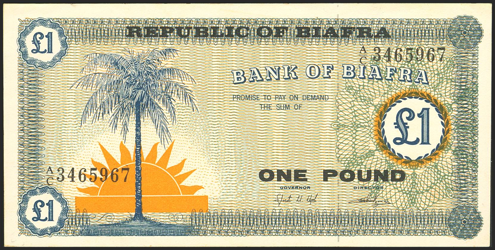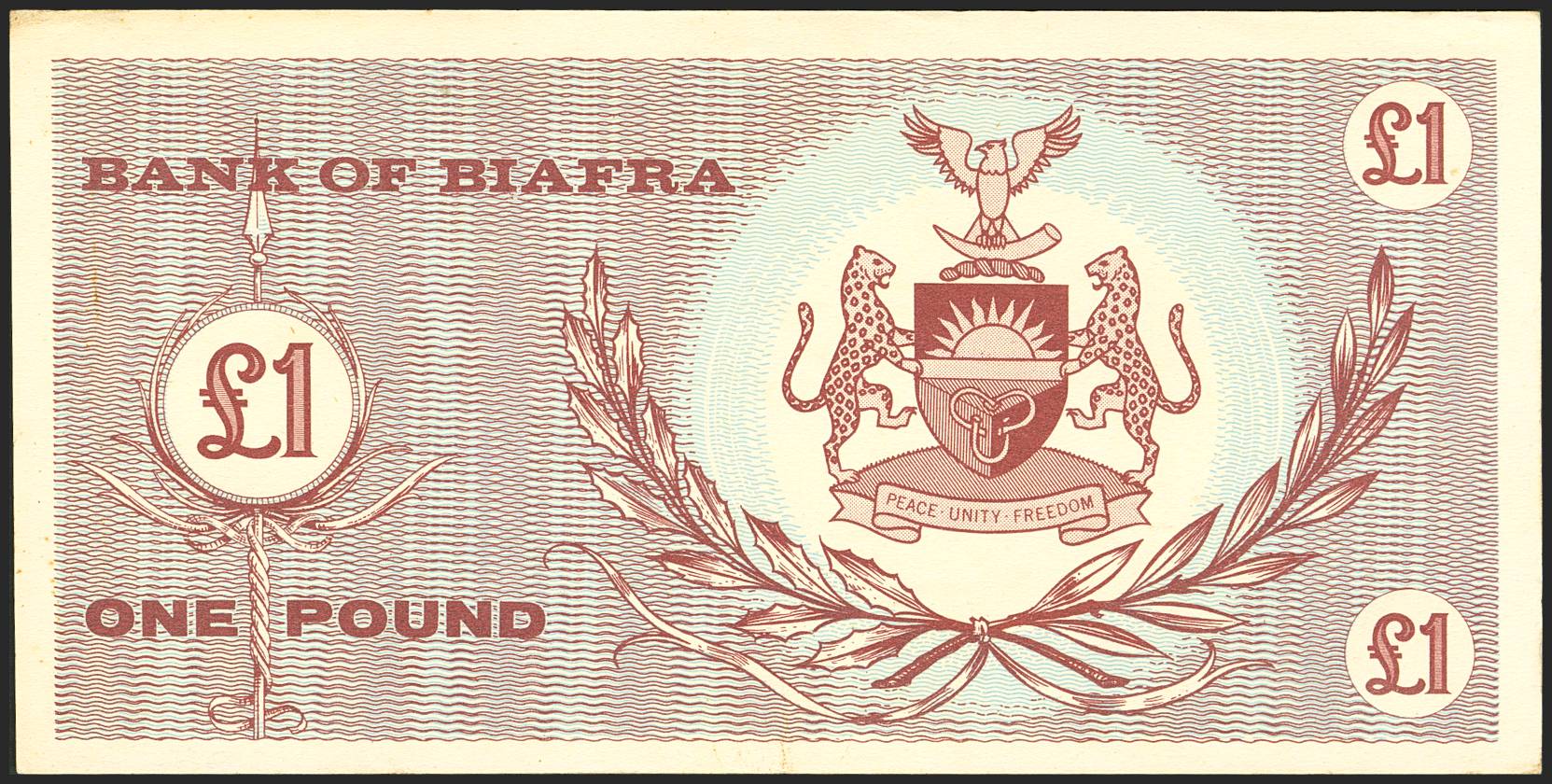 BIAFRA. 1 Pound. (1968ca). Bank of Biafra. (Pick: 2). Unusual in this quality. Less than Uncirculated.