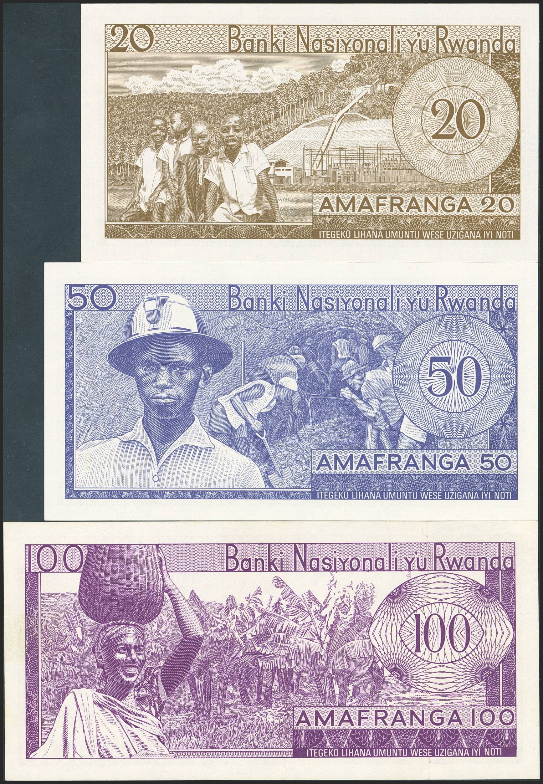 RWANDA. Lot of 3 notes of 20 Francs, 50 Francs and 100 Francs. (1964ca). Banque Nationale. (Pick: 6e, 7c, 8a). Uncirculated / About Uncirculated.