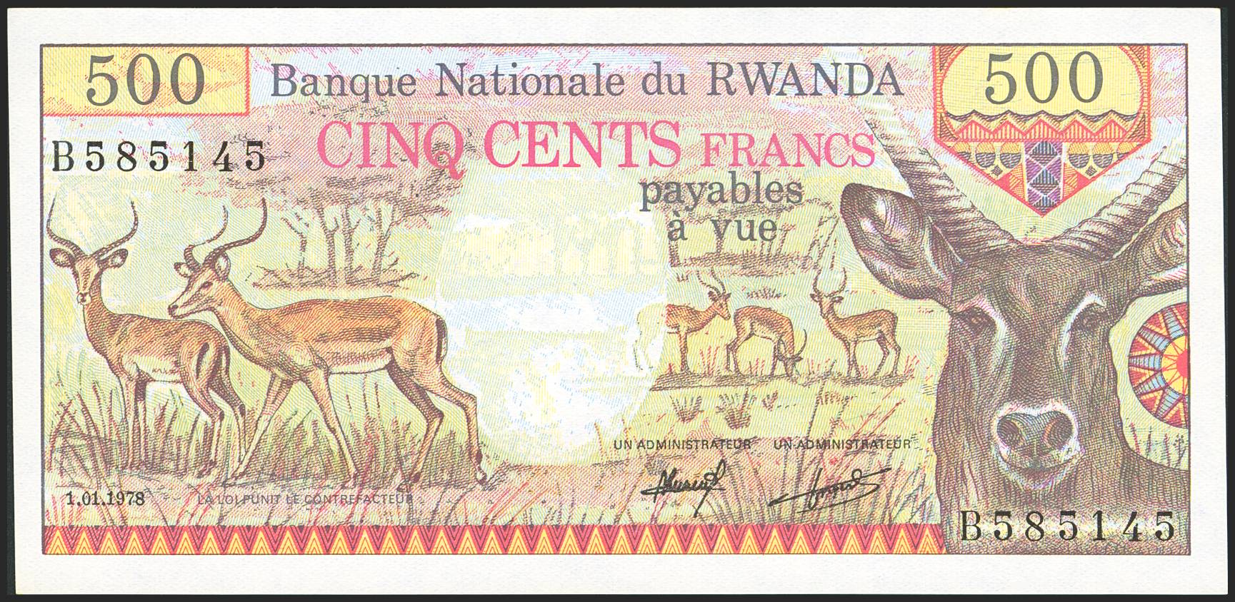 RWANDA. 500 Francs. 1 January 1978. Banque Nationale. (Pick: 13a). Less than Uncirculated. PMG SI.