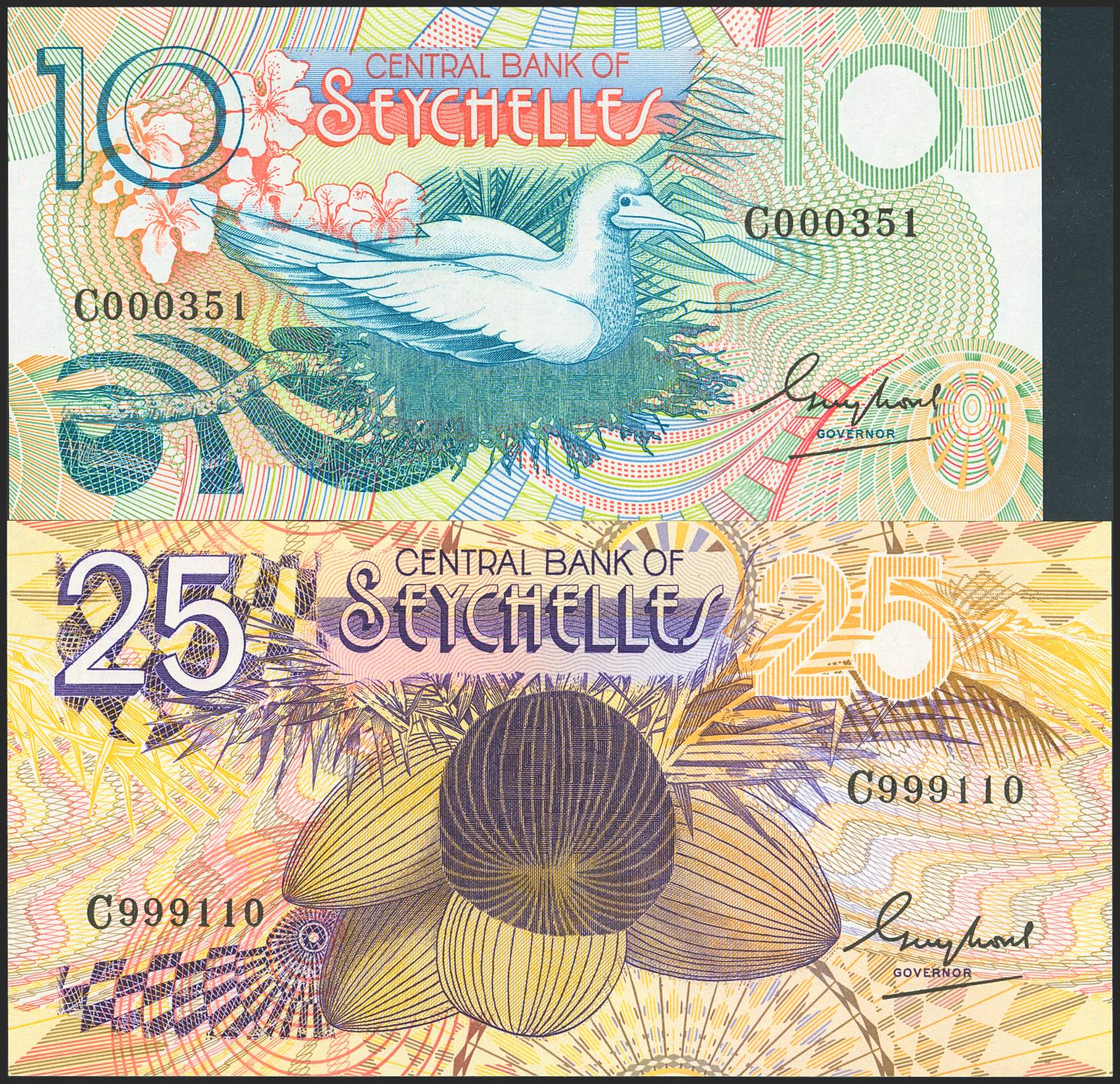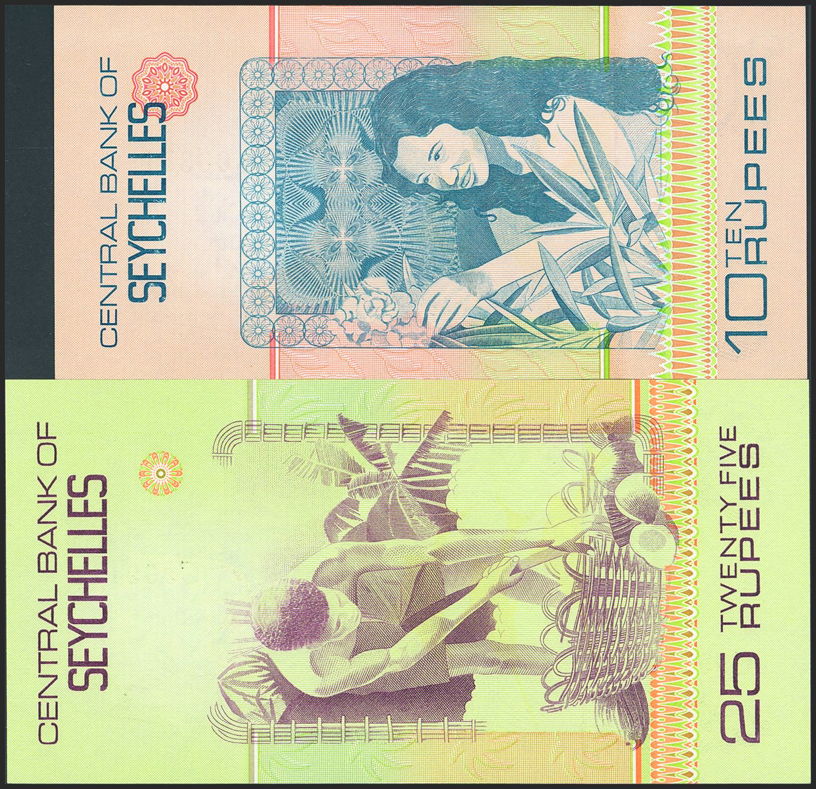 SEYCHELLES. Lot of 2 notes of 10 Rupees and 25 Rupees. (1989ca). Central Bank. (Pick: 28, 29). Uncirculated.