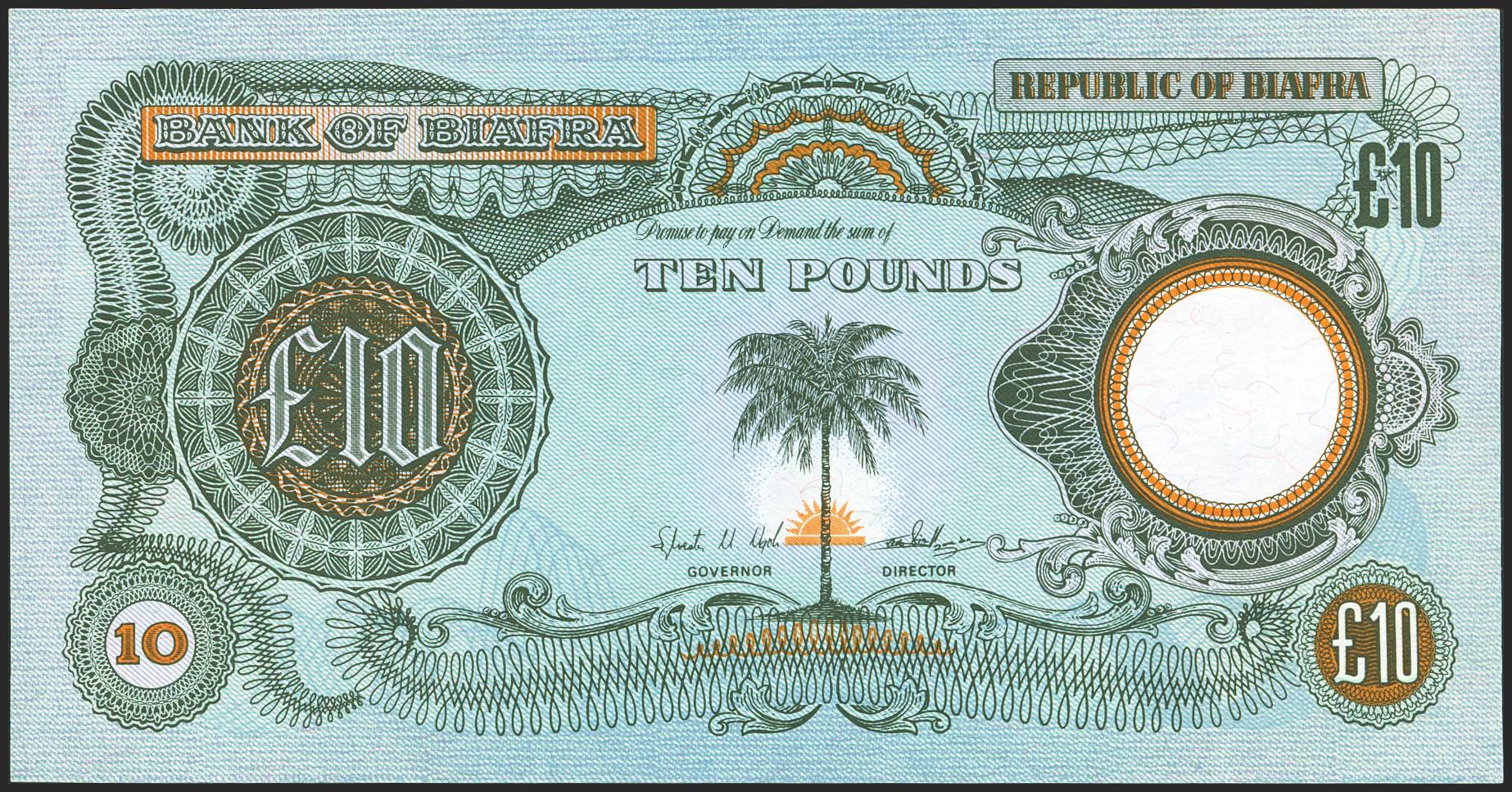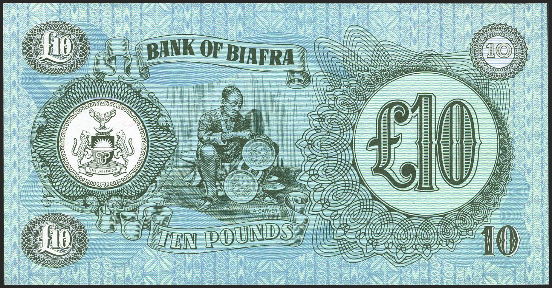 BIAFRA. 10 Pounds. (1969ca). Bank of Biafra. (Pick: 7b). Unusual in this quality. Uncirculated.