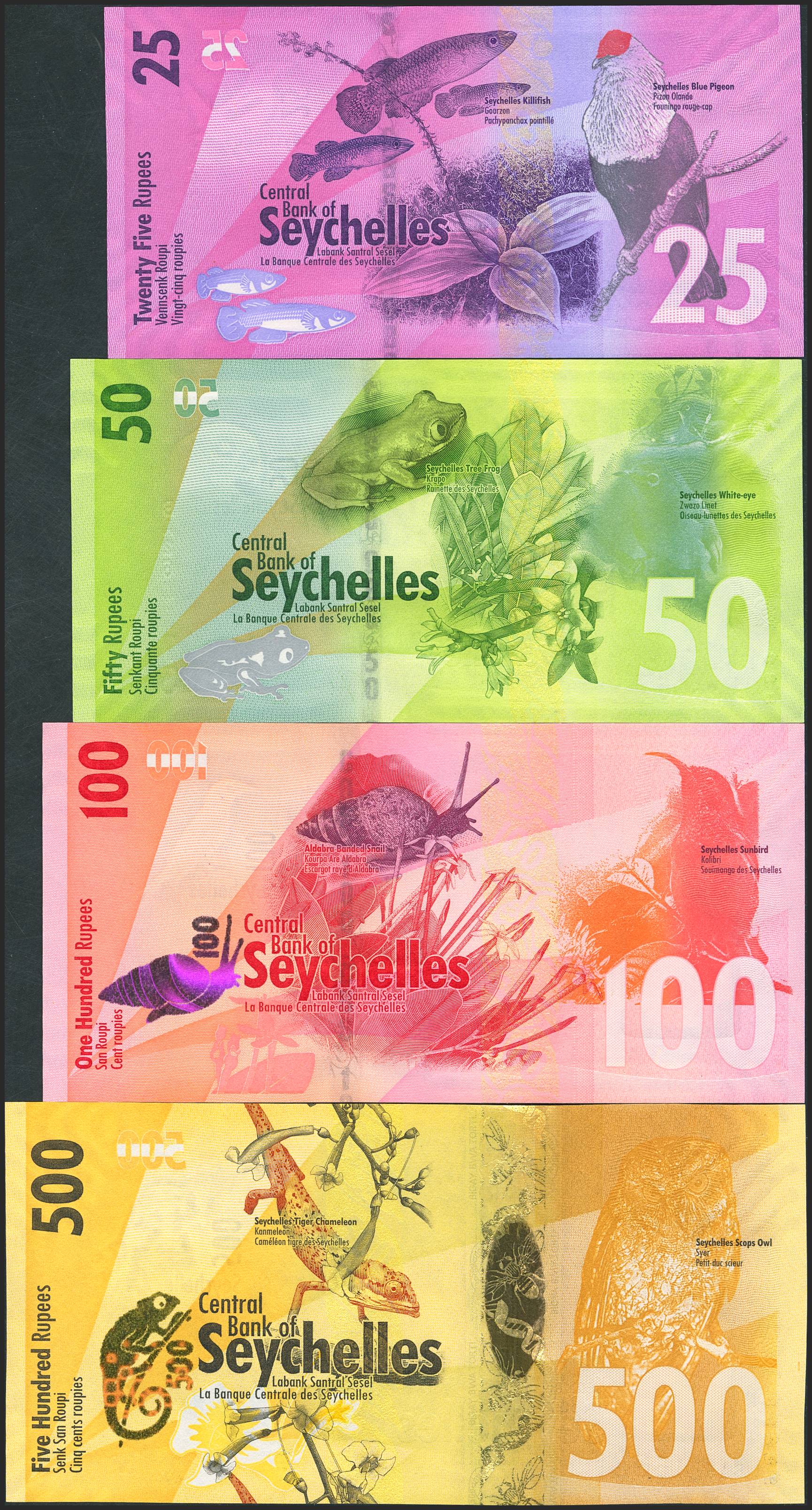 SEYCHELLES. Lot of 4 notes of 25 Rupees, 50 Rupees, 100 Rupees and 500 Rupees. (2016ca). Central Bank. (Pick: 48, 49, 50, 51). Uncirculated.