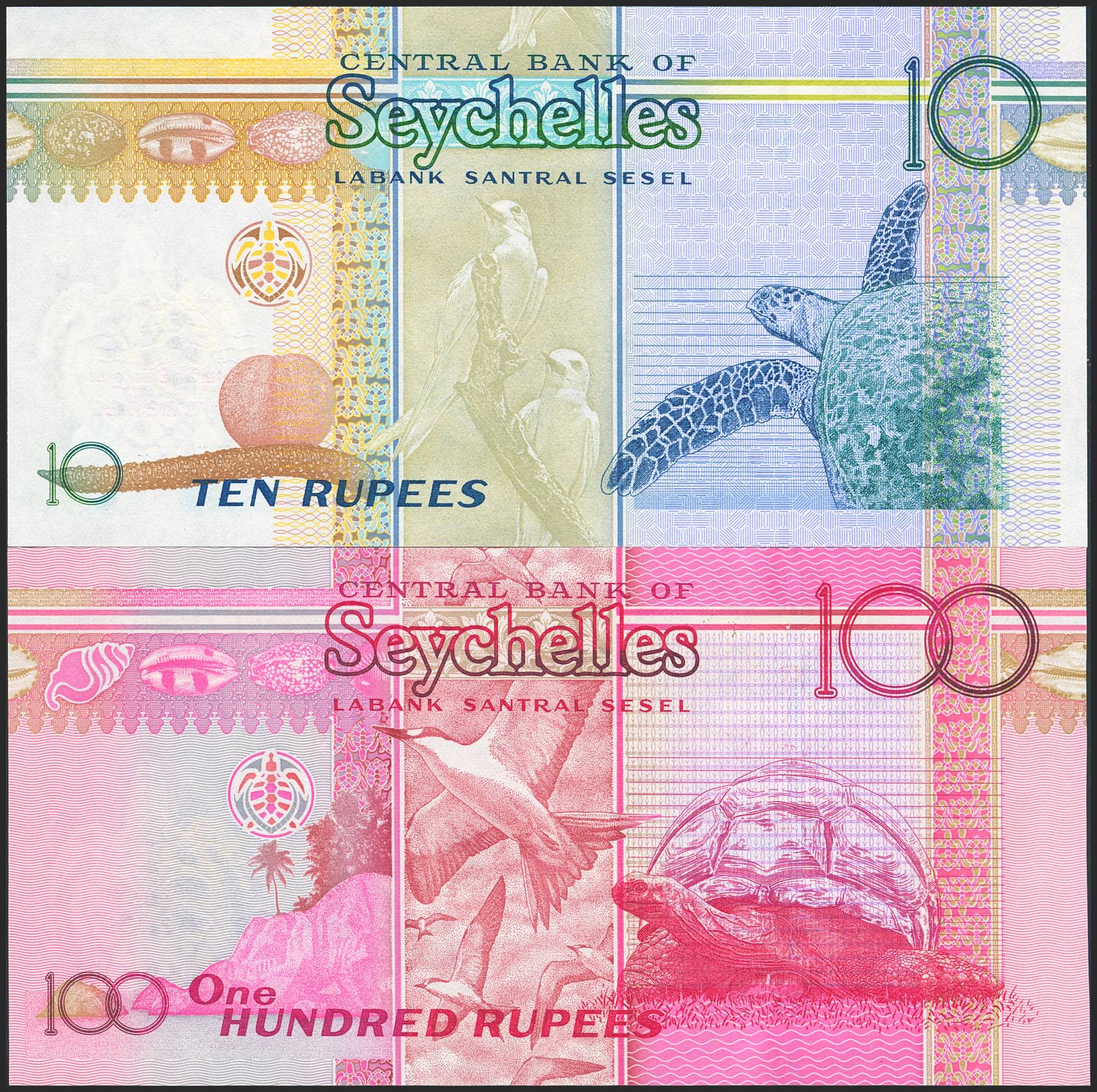 SEYCHELLES. Lot of 2 notes of 10 Rupees and 100 Rupees. (2013ca). Central Bank. (Pick: 46, 47). Uncirculated.
