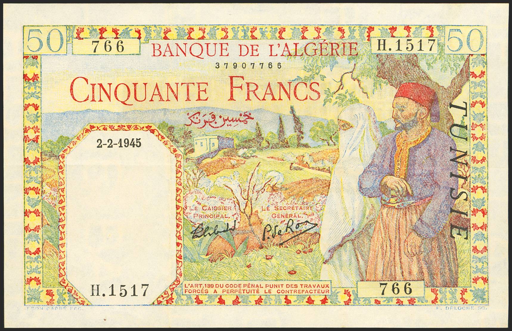TUNISIA. 50 Francs. 2 February 1945. Banque de l'Algérie. (Pick: 12b). More than Very Fine.