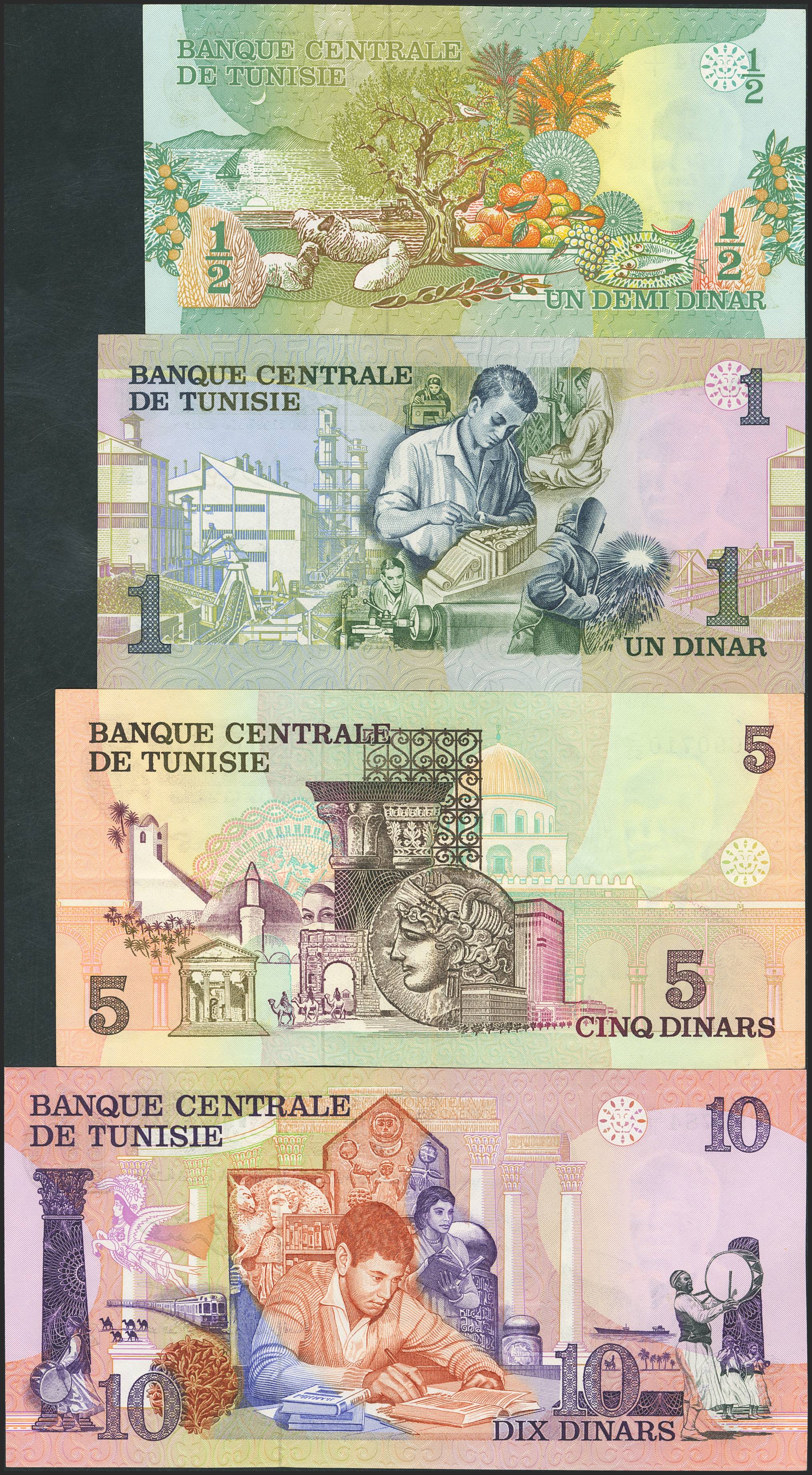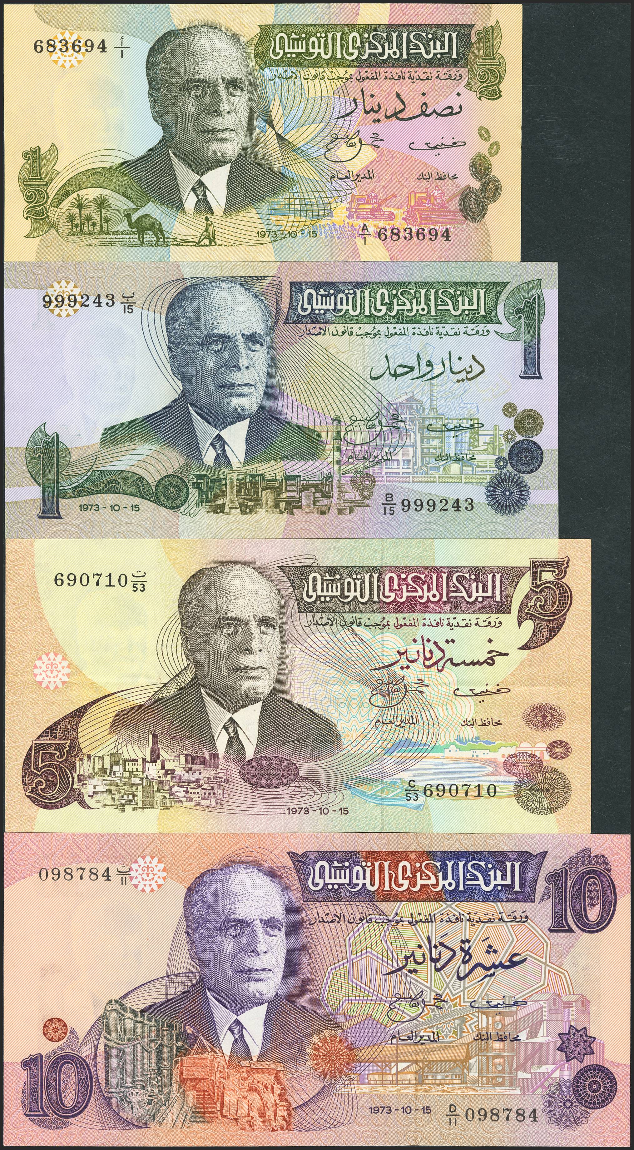 TUNISIA. Lot of 4 notes of ½ Dinar, 1 Dinar, 5 Dinars and 10 Dinars. 15 October 1973. Banque Centrale de Tunisie. (Pick: 69, 70, 71, 72). Less than Uncirculated / Very Fine.