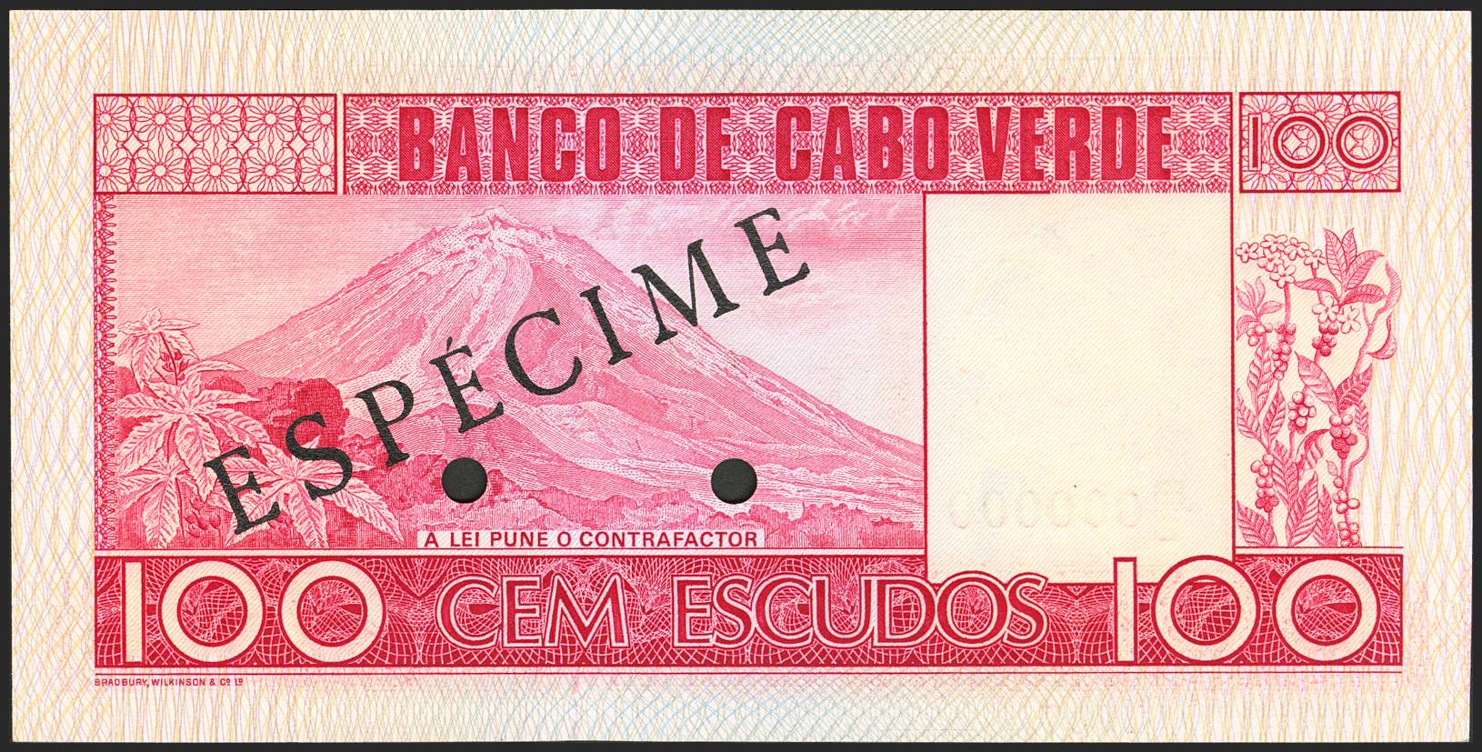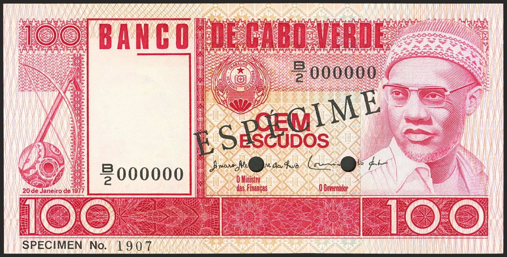 CAPE VERDE. 100 Escudos. 20 January 1977. SPECIMEN and numeration B/2 000000. Bank of Cabo Verde. (Pick: 54s). Uncirculated.
