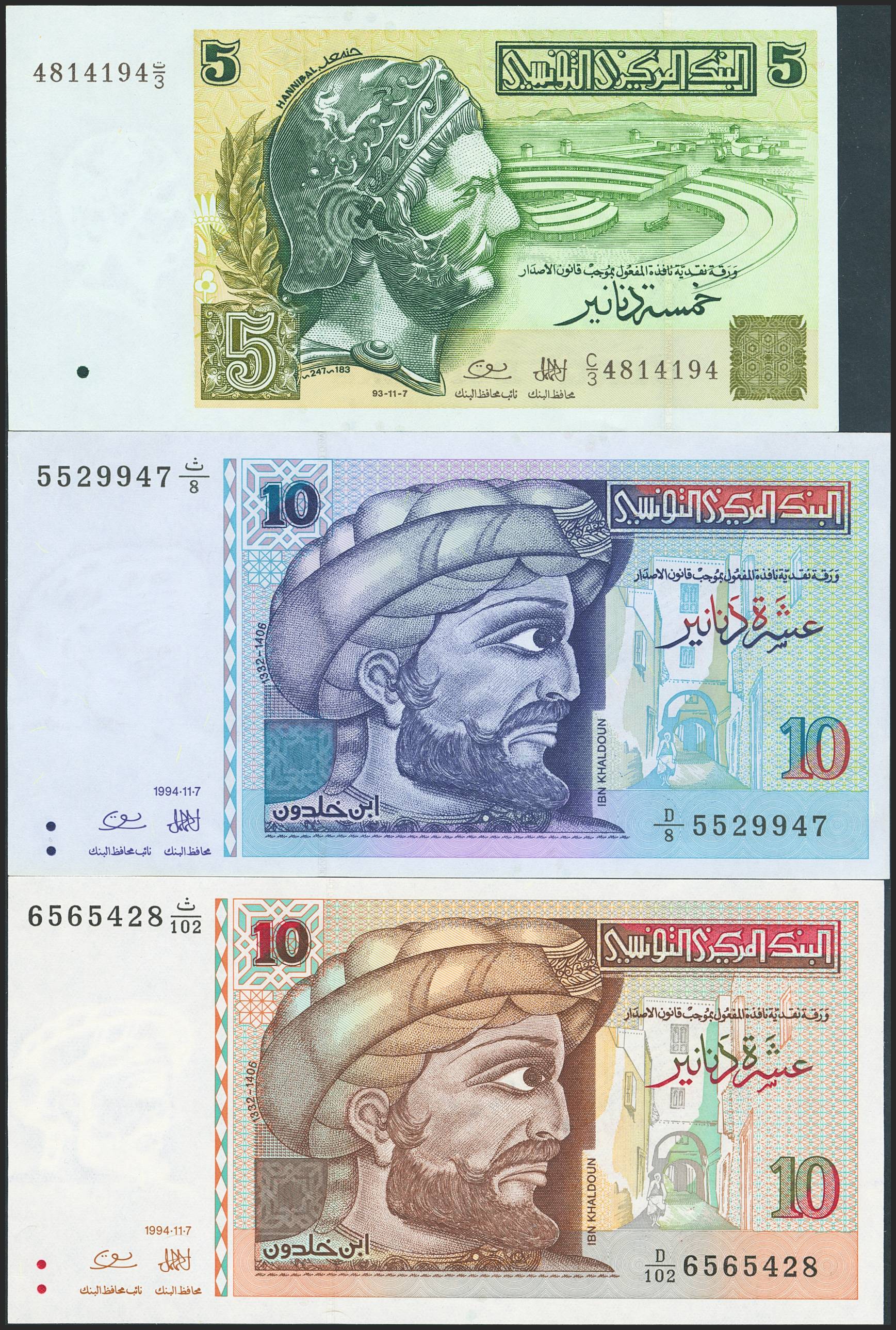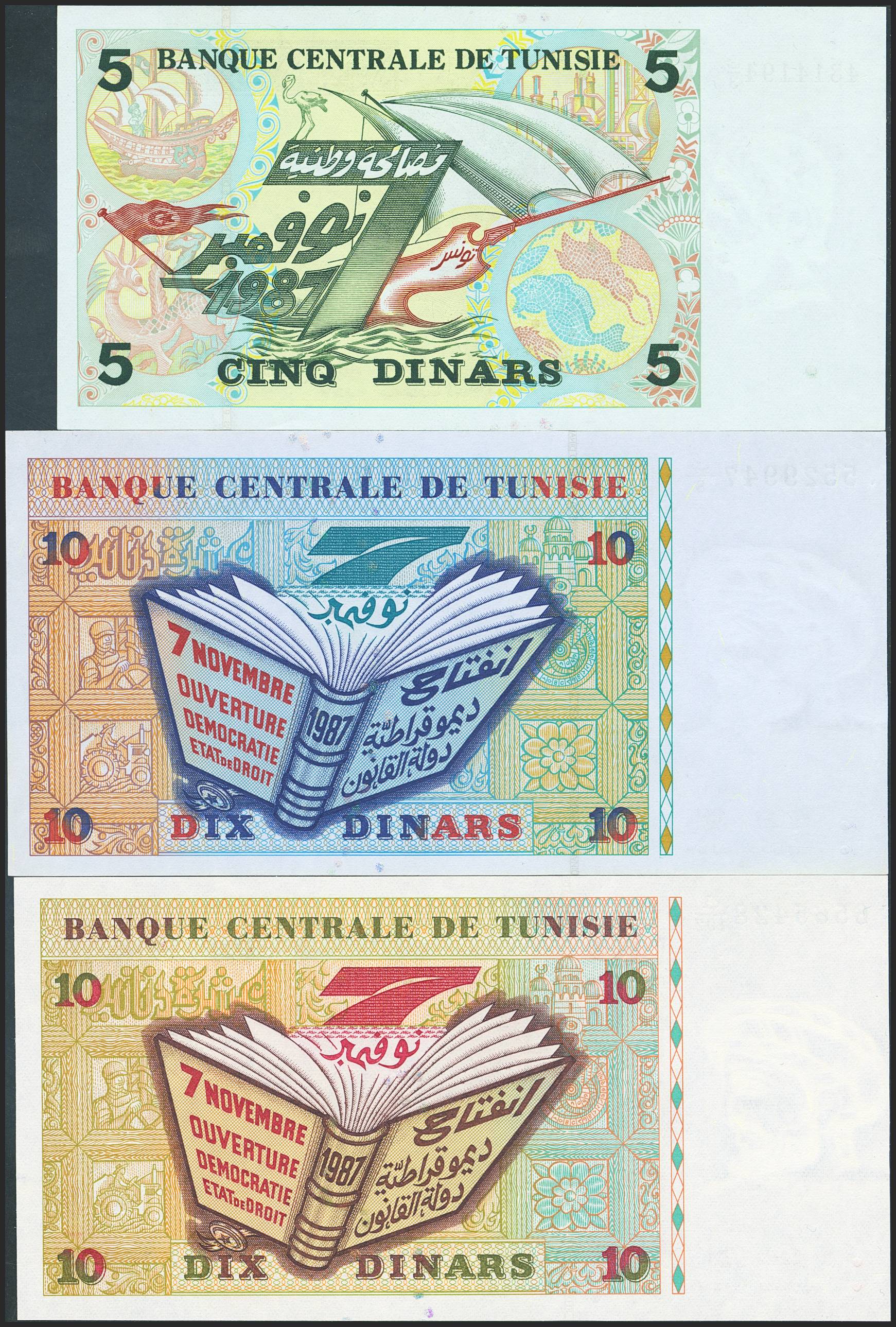 TUNISIA. Lot of 3 notes of 5 Dinars and 10 Dinars (2). 7 November 1944. Banque Centrale de Tunisie. (Pick: 86, 87, 87A). Uncirculated.