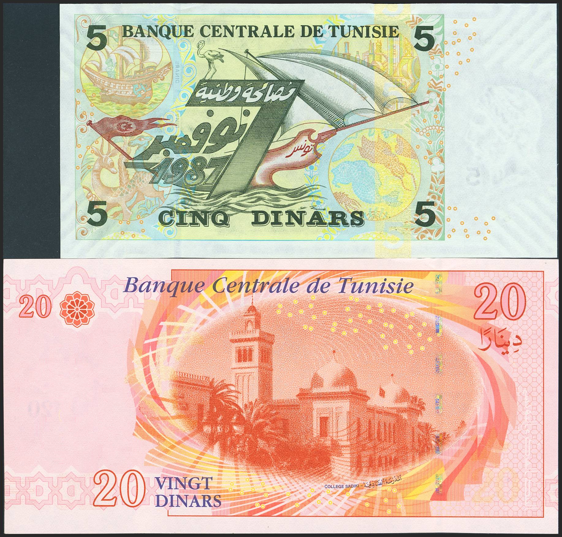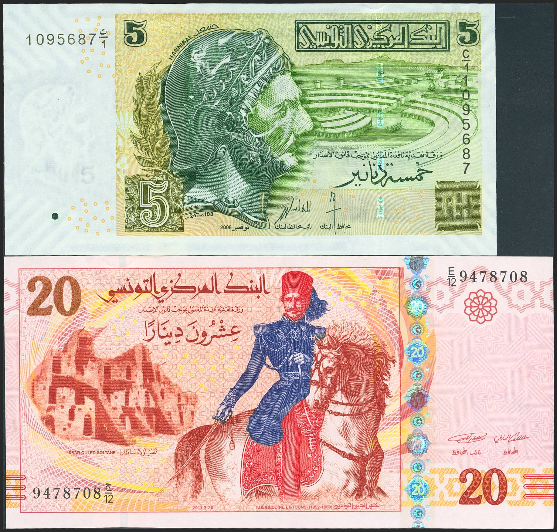 TUNISIA. Lot of 2 notes of 10 Dinars and 20 Dinars. (2008ca). Banque Centrale de Tunisie. (Pick: 92, 93). Uncirculated.