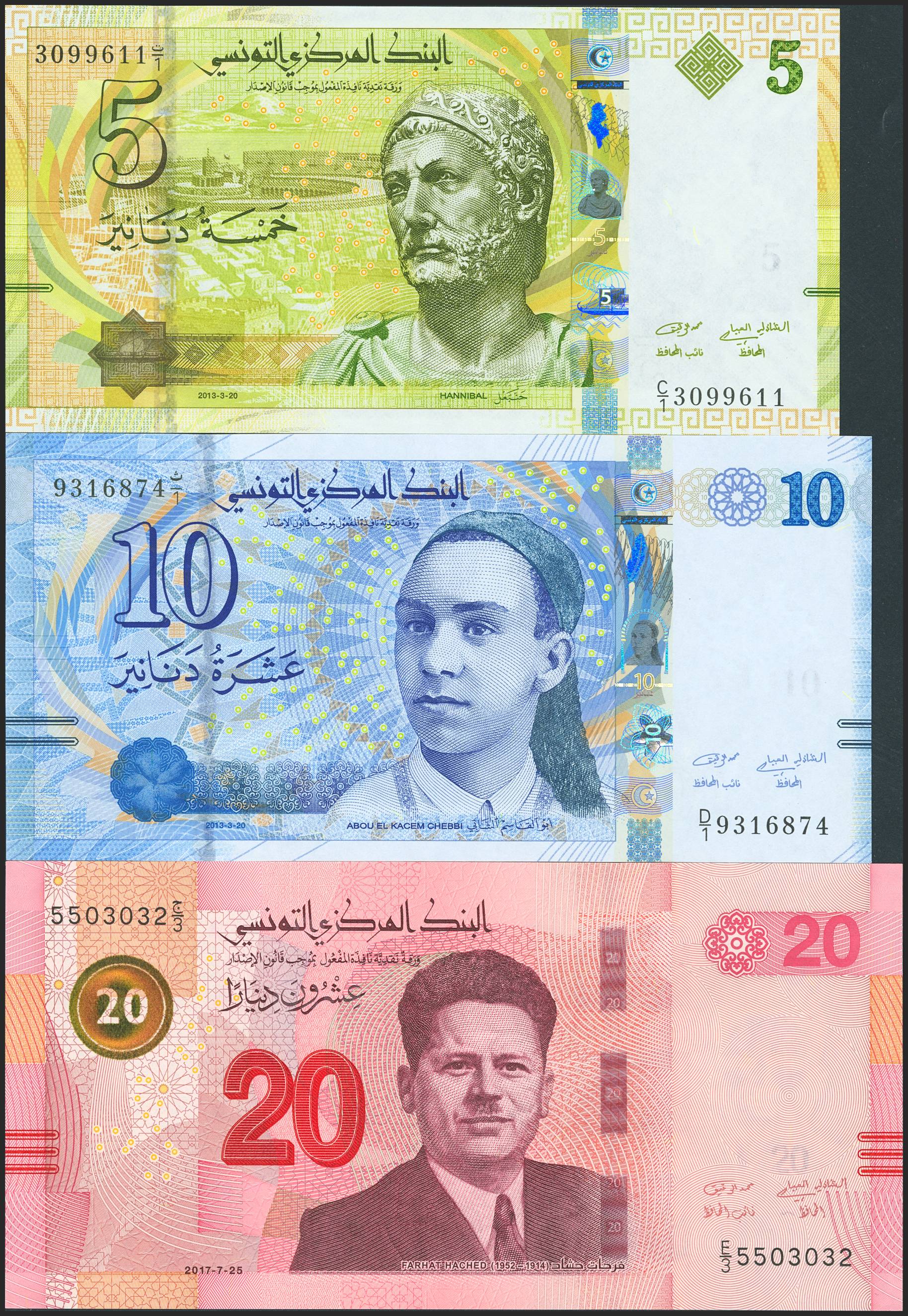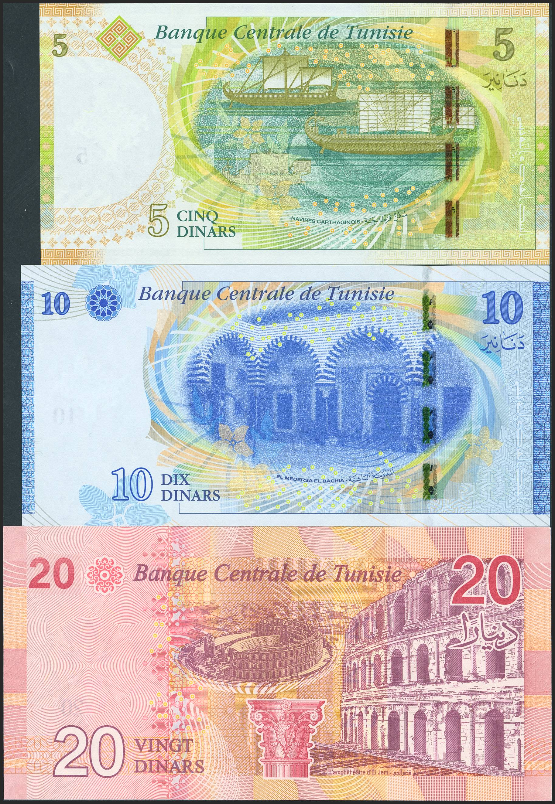 TUNISIA. Lot of 3 notes of 5 Dinars and 10 Dinars (2). (2013ca). Banque Centrale de Tunisie. (Pick: 95, 96, 97). Uncirculated.