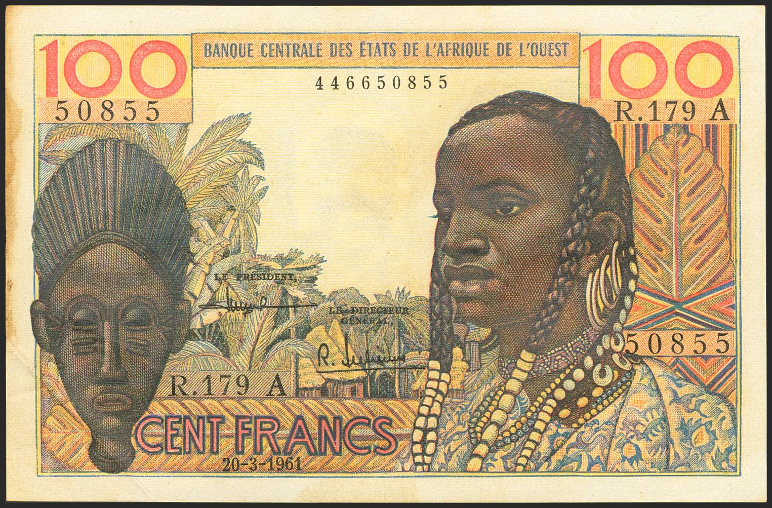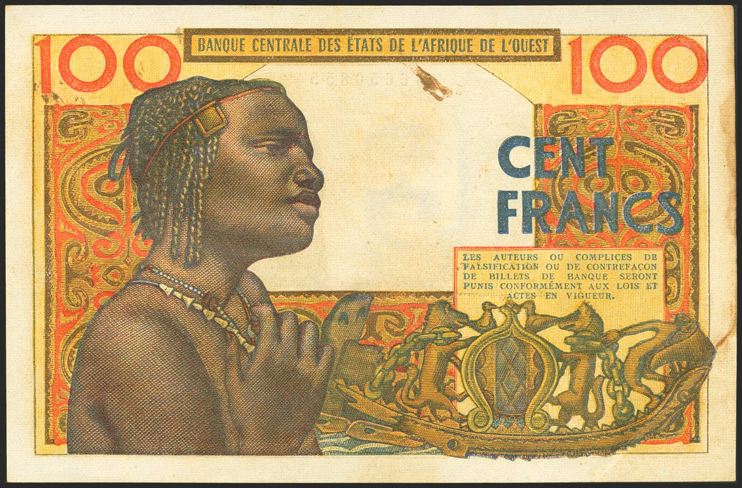 WEST AFRICAN STATES. 100 Francs. 20 March 1961. Banque Centrale des Etats de l'Afrique de l'Ouest. (Pick: 101Ac). Stains. Extremely Fine.