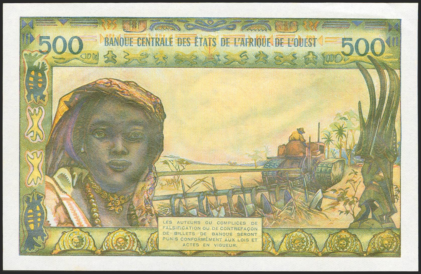 WEST AFRICAN STATES. 500 Francs. (1976ca). Banque Centrale des Etats de l'Afrique de l'Ouest. (Pick: 802Tm). Less than Uncirculated.