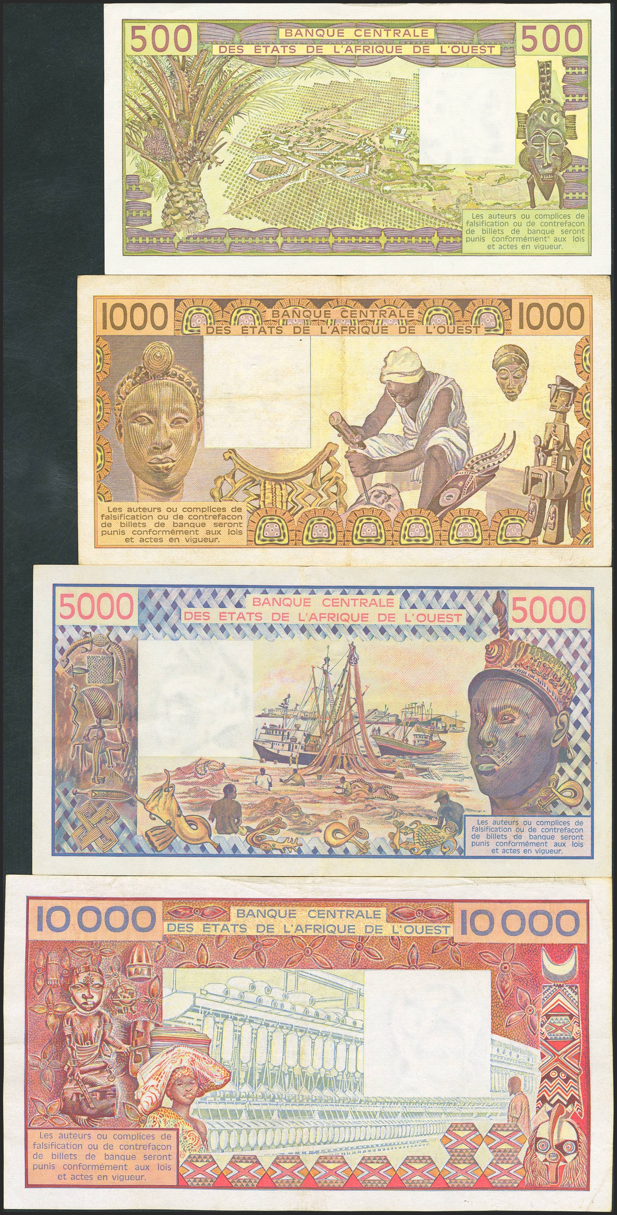 WEST AFRICAN STATES. Lot of 4 notes of 500 Francs, 1000 Francs, 5000 Francs and 10000 Francs. (1977ca). Banque Centrale des Etats de l'Afrique de l'Ouest. (Pick: 106Af, 107Ag, 108Aa, 109Ad). Less than Uncirculated / Fine.