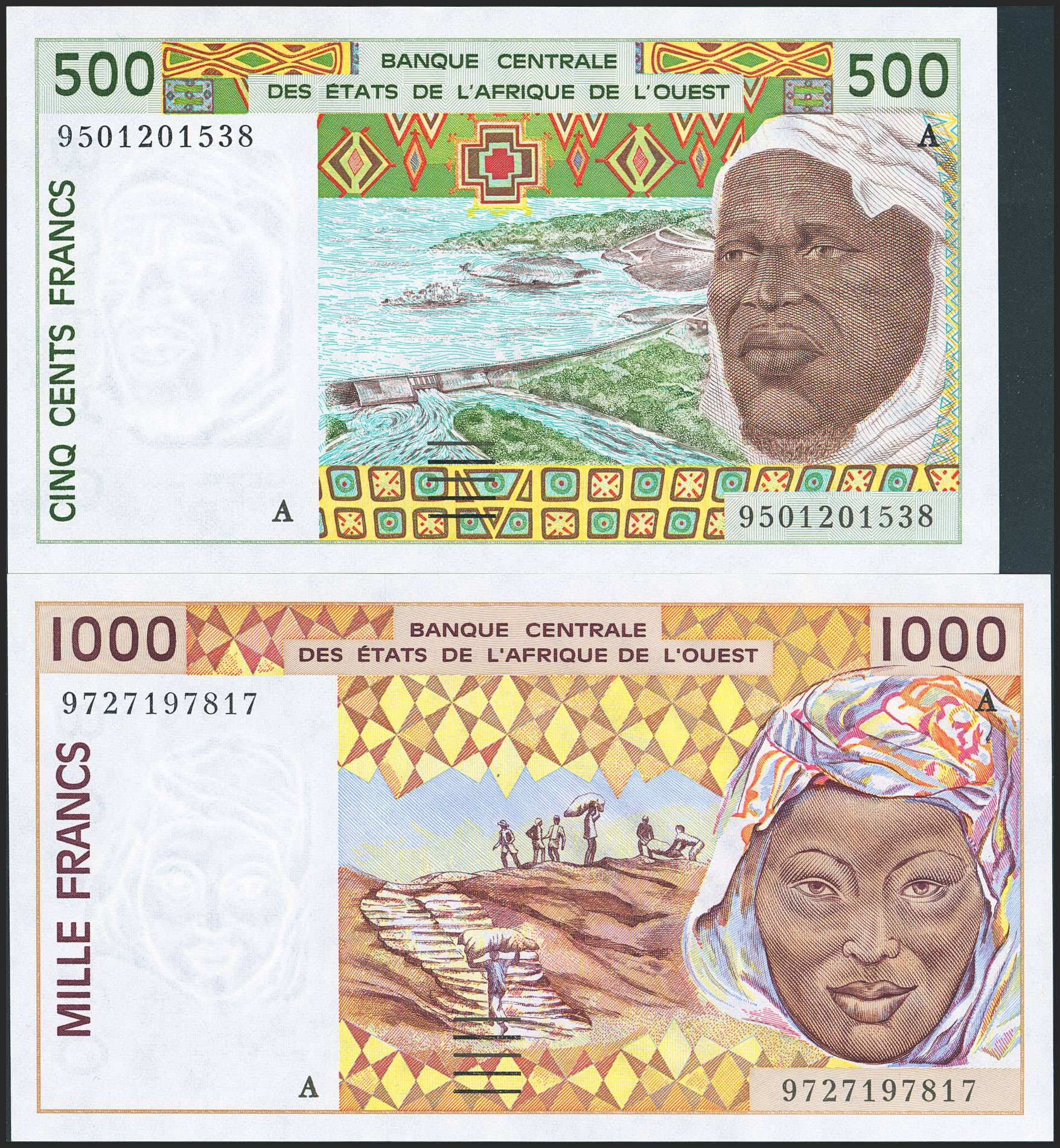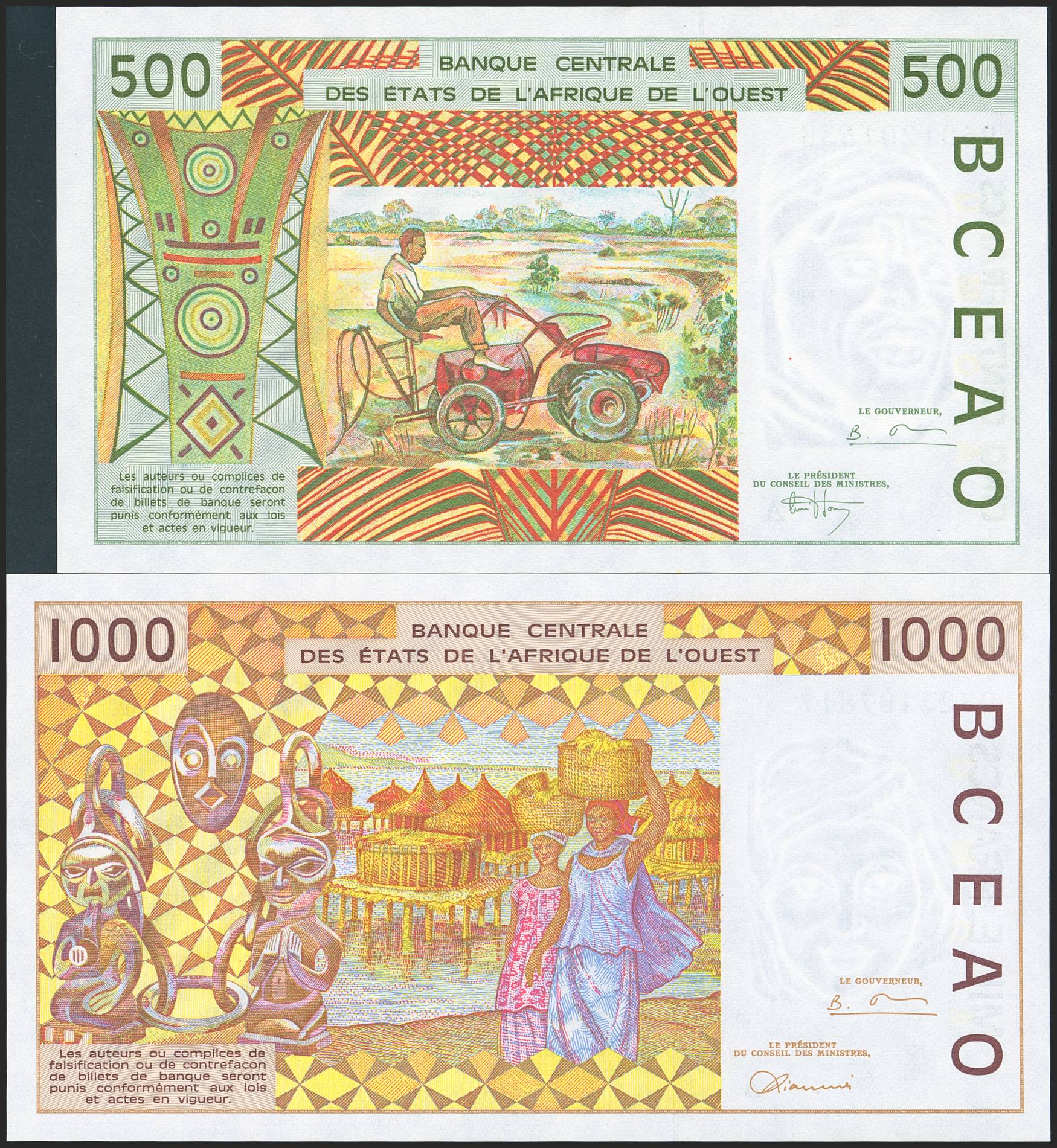 WEST AFRICAN STATES. Lot of 2 notes of 500 Francs and 1000 Francs. 1997. Banque Centrale des Etats de l'Afrique de l'Ouest. (Pick: 110Ag, 111Ag). Uncirculated.