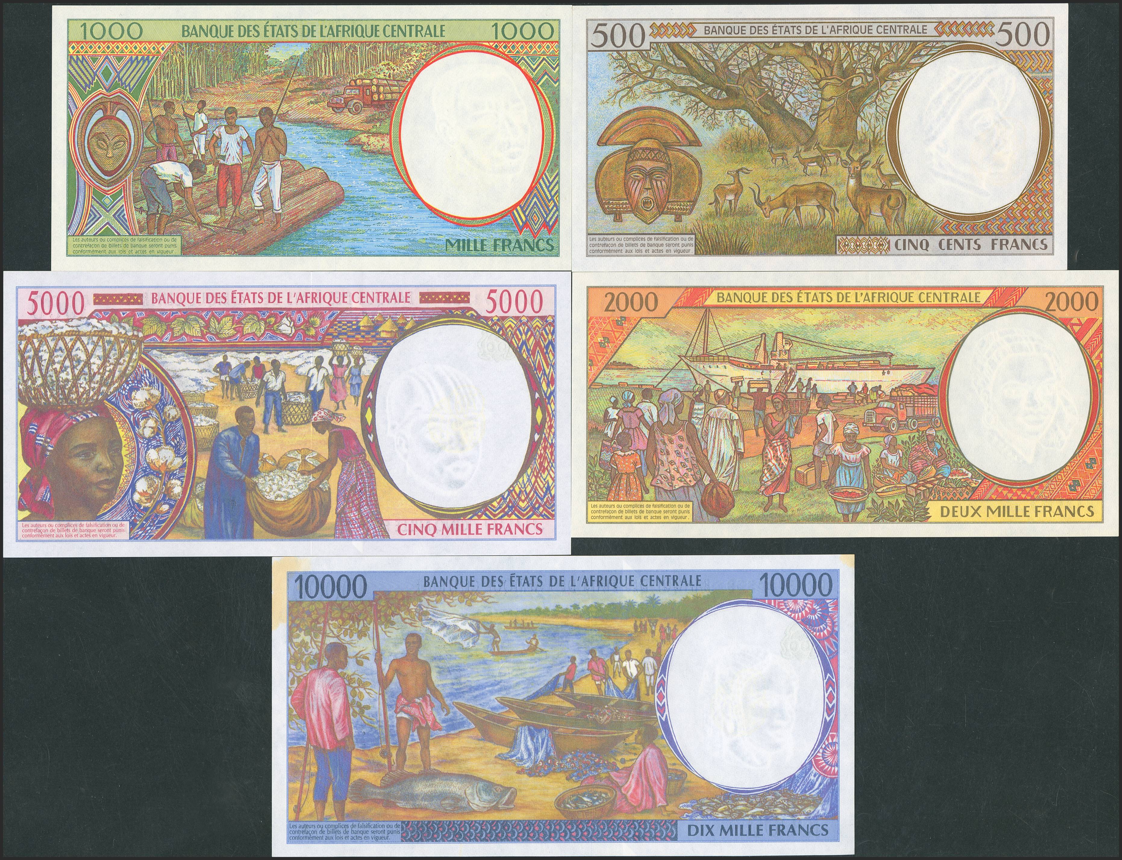 CENTRAL AFRICAN STAT. Lot of 5 notes of 500 Francs, 1000 Francs, 2000 Francs, 5000 Francs and 10000 Francs. (1993ca). Banque des Etats de l'Afrique Centrale. (Pick: 401Lb, 502Nb, 203Ea, 204Ea 405Lg). 10000 francs stains. Uncirculated / Less than Uncirculated.