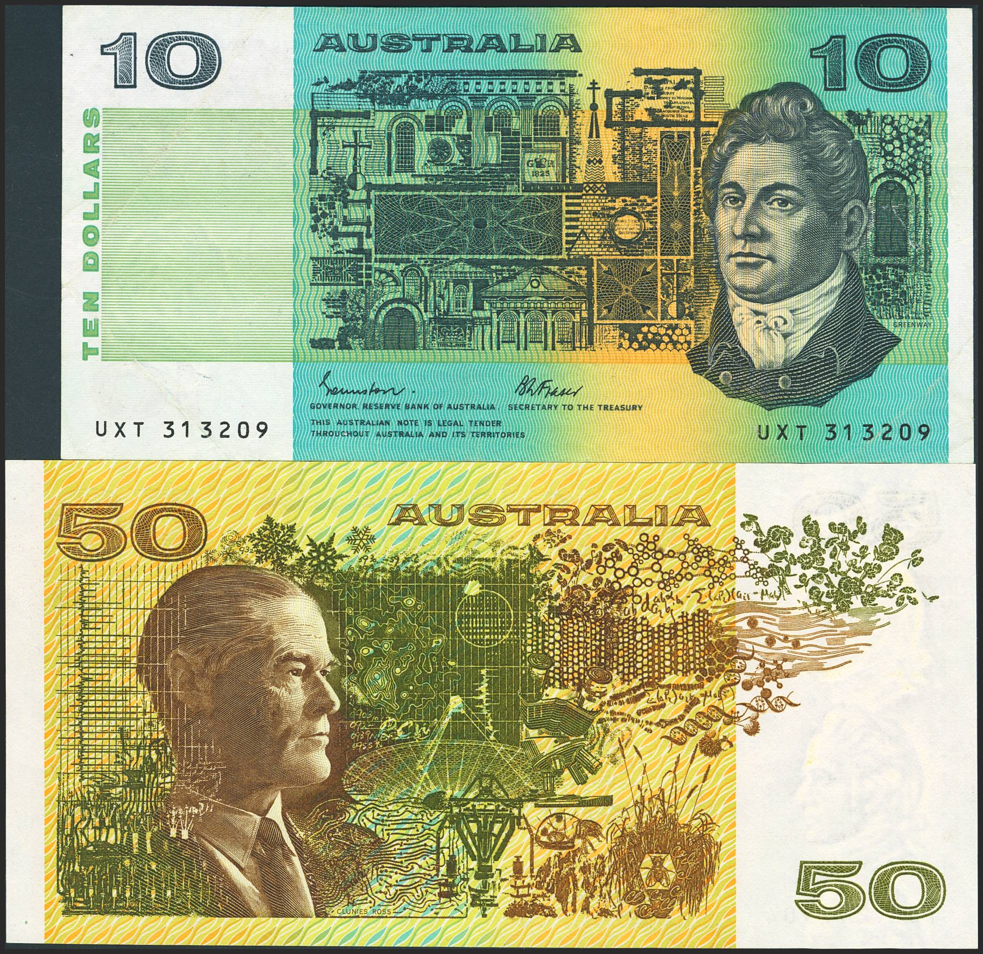 AUSTRALIA. Set of 2 notes of 10 Dollars (pinholes) and 50 Dollars. (1983ca). Reserve Bank. (Pick: 45e, 47e). Very Fine.