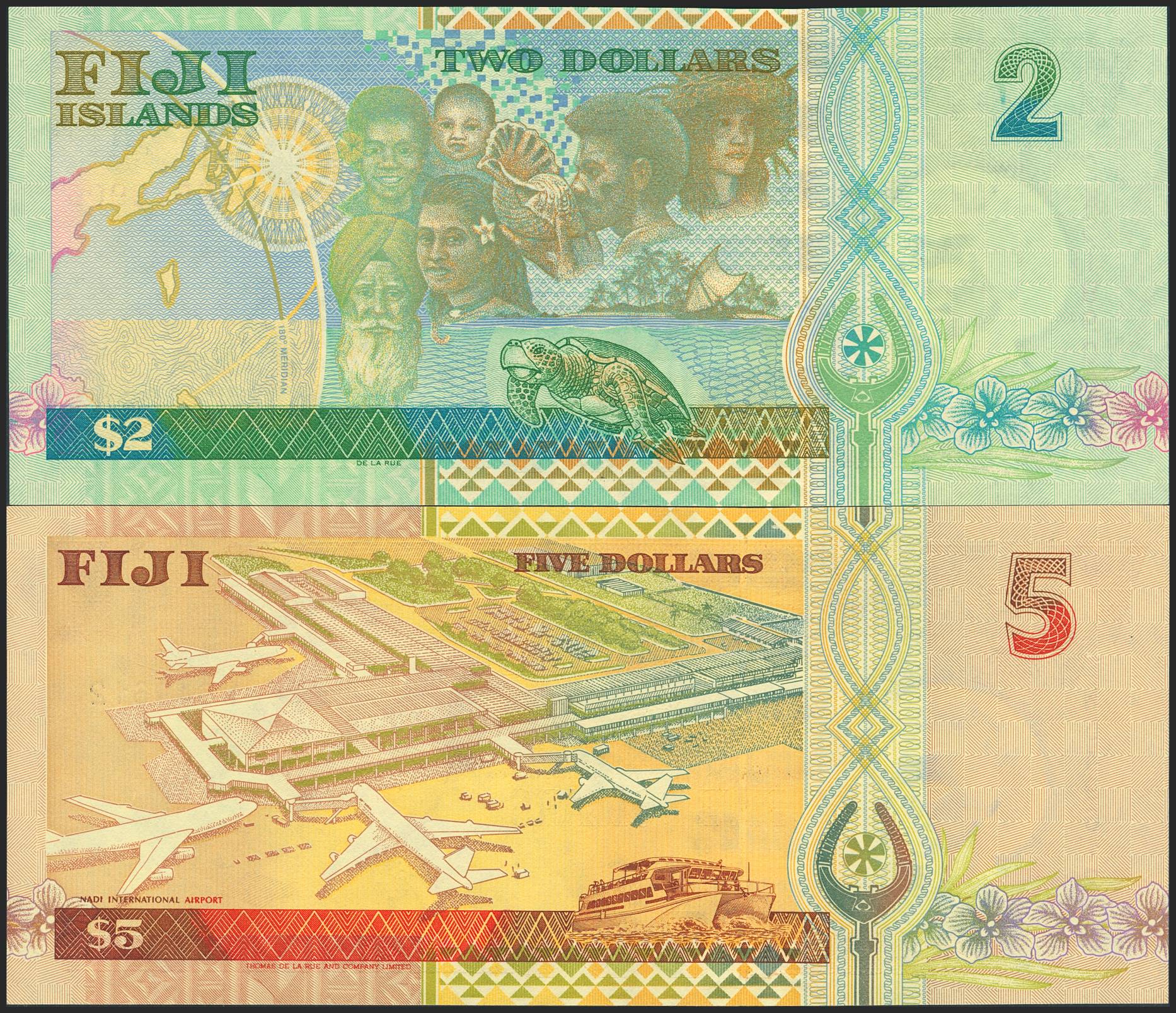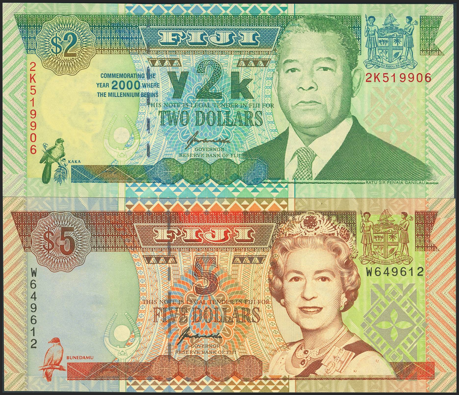 FIJI. Set of 2 notes of 2 Dollars and 5 Dollars. (2011ca). Reserve Bank. (Pick: 101a, 102a). Uncirculated.
