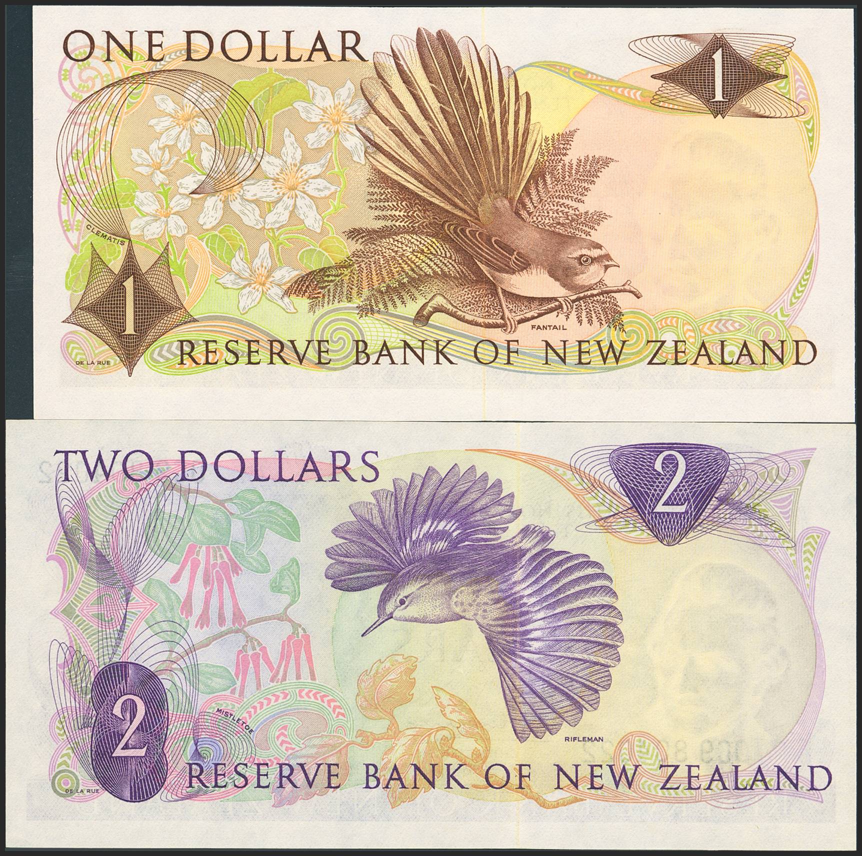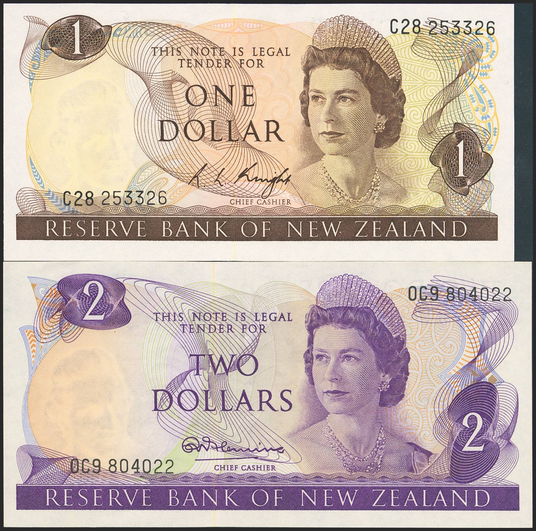 NEW ZEALAND. Set of 2 notes of 1 Dollar and 2 Dollars. (1967ca). Reserve Bank. (Pick: 163c, 164a). Uncirculated / Extremely Fine.