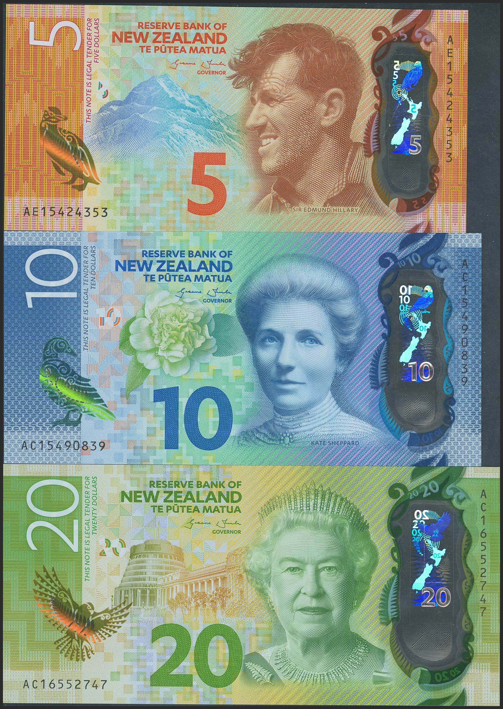 NEW ZEALAND. Set of 3 notes of 5 Dollars, 10 Dollars and 20 Dollars. 2016. Reserve Bank. (Pick: 191, 192, 193). Uncirculated.