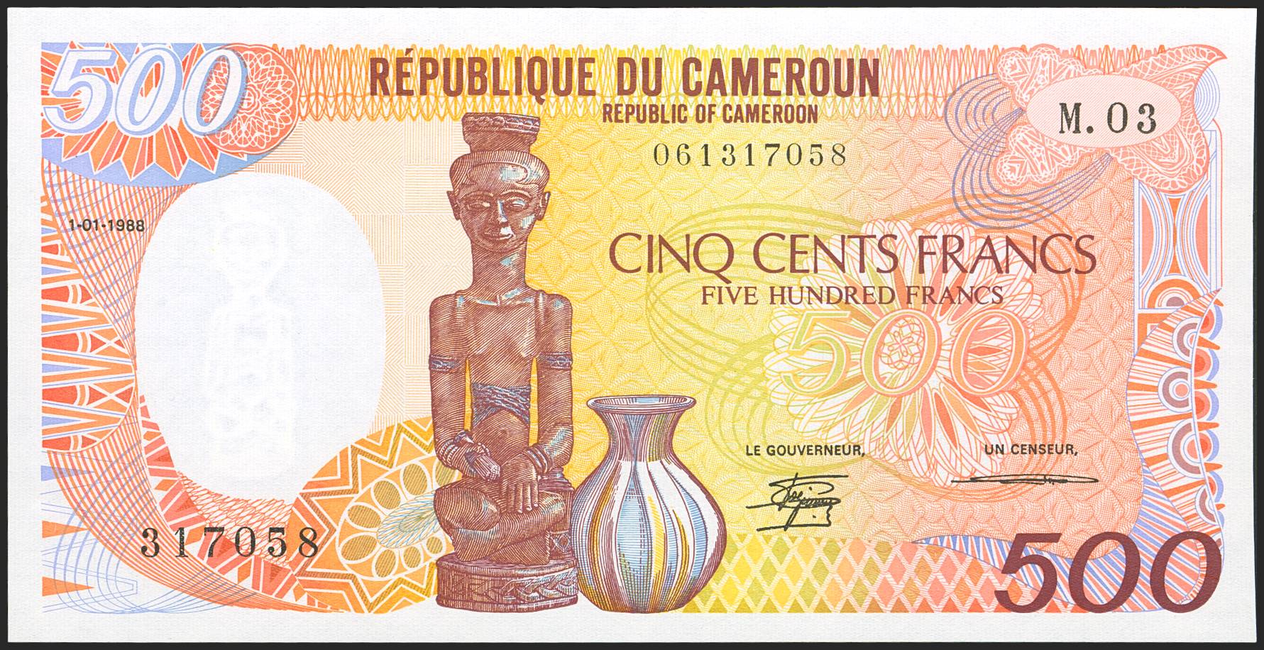 CAMEROON. 500 Francs. 1 January 1988. Republique du Cameroun. (Pick: 24a). About Uncirculated.