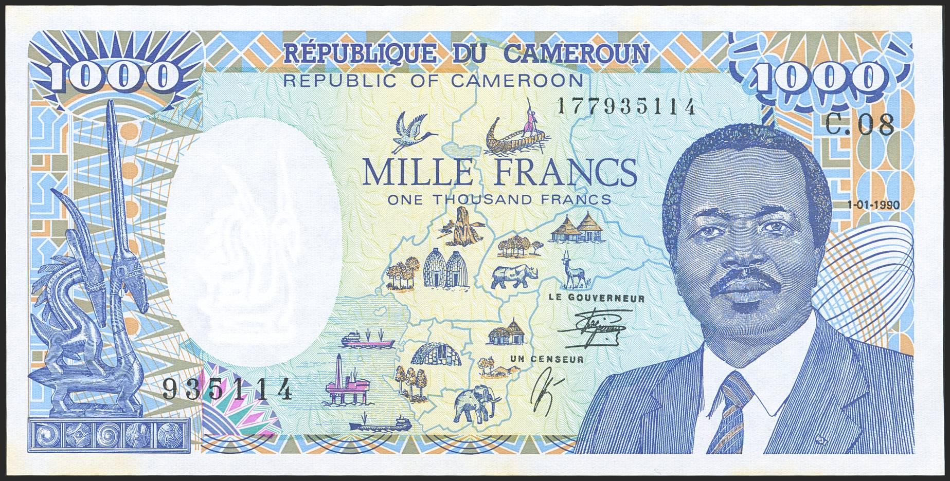 CAMEROON. 1000 Francs. 1 January 1990. Republique du Cameroun. (Pick: 26b). Stains. Less than Uncirculated.