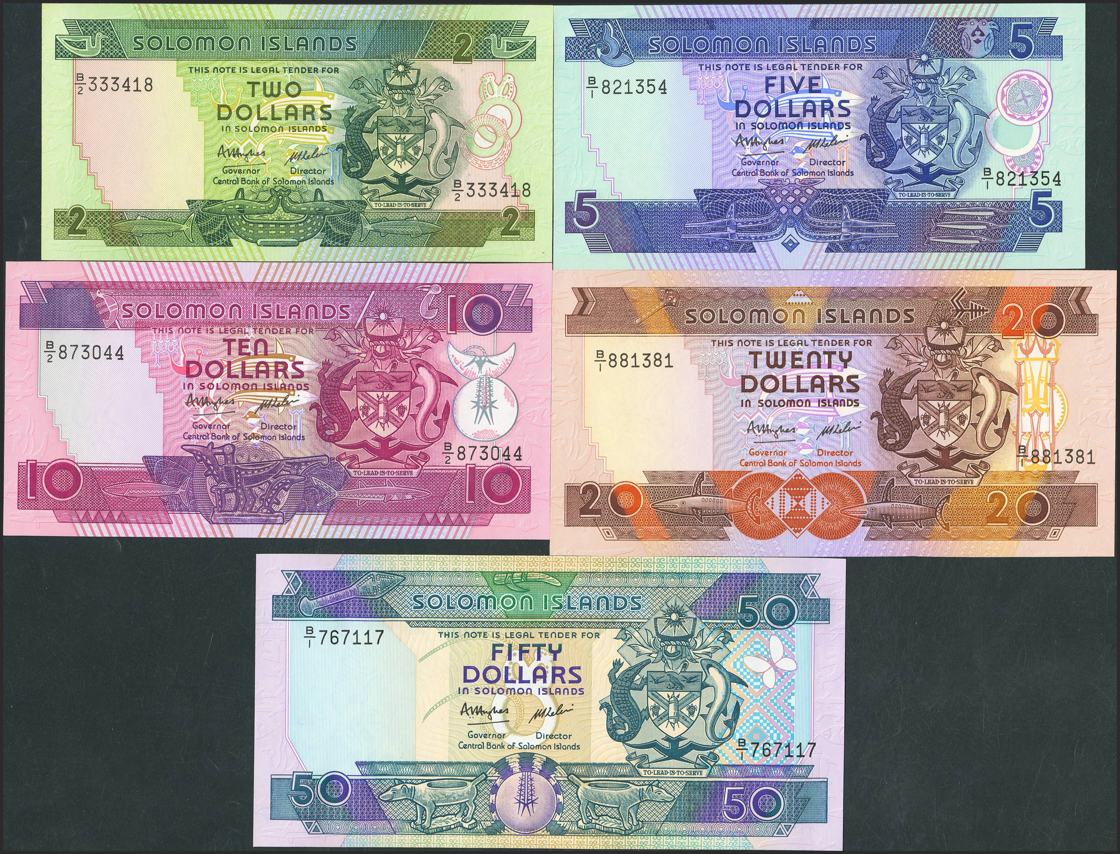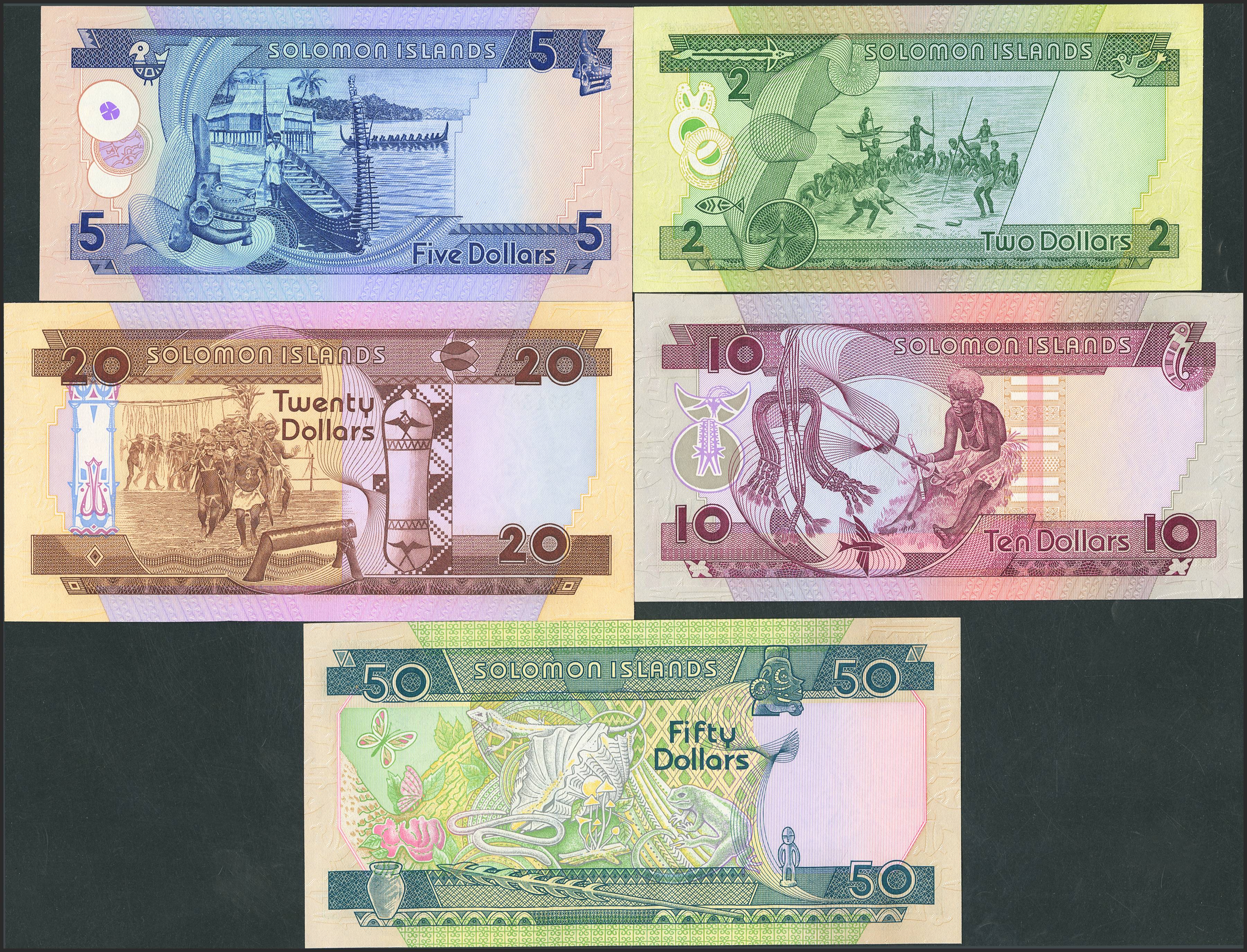 SOLOMON ISLANDS. Set of 5 notes of 2 Dollars, 5 Dollars, 10 Dollars, 20 Dollars and 50 Dollars. (1986ca). Central Bank. (Pick: 13, 14, 15, 16, 17). Uncirculated.
