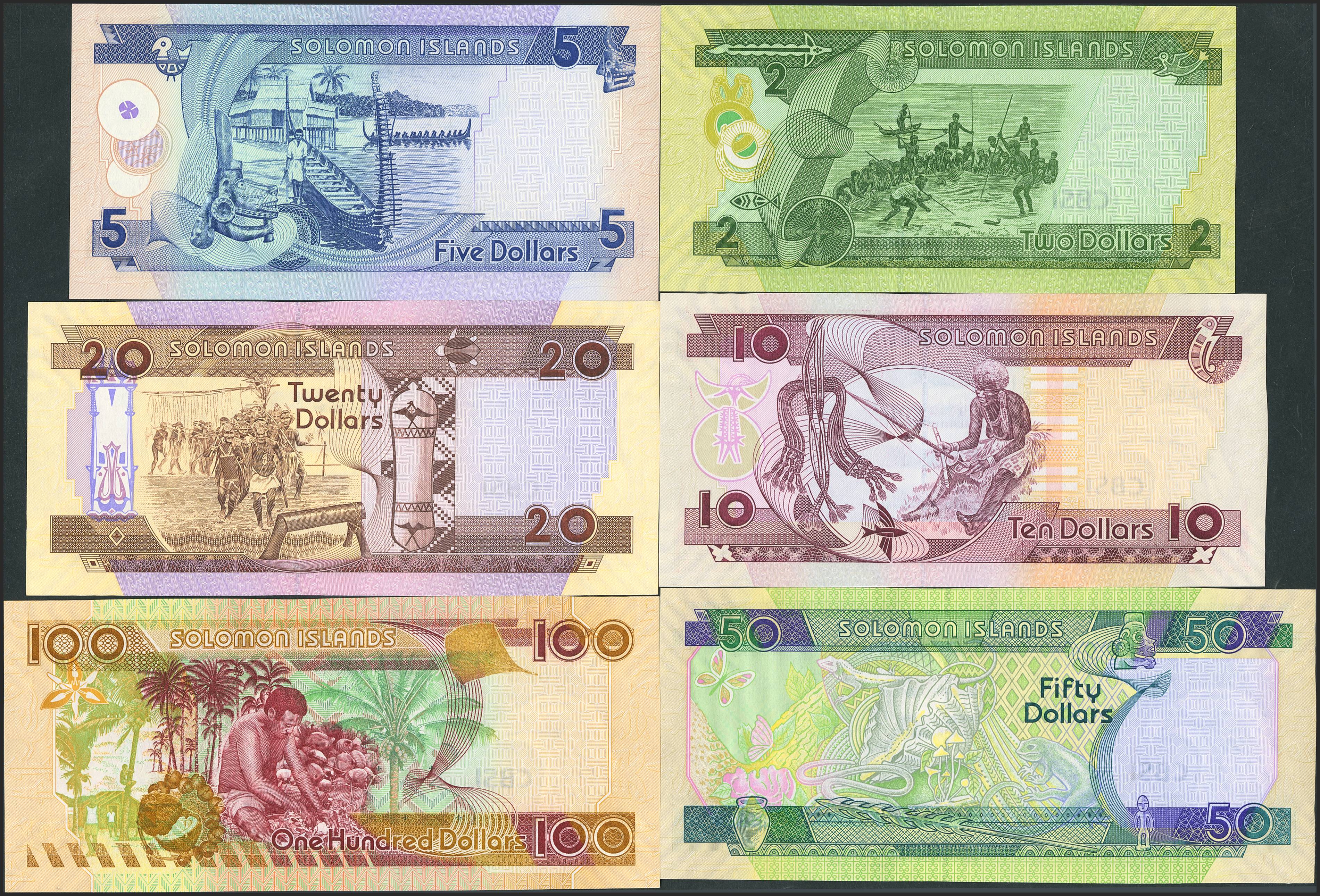 SOLOMON ISLANDS. Set of 6 notes of 2 Dollars, 5 Dollars, 10 Dollars, 20 Dollars, 50 Dollars and 100 Dollars. (2004ca). Central Bank. (Pick: 25, 26, 27, 28, 29, 30). Uncirculated.
