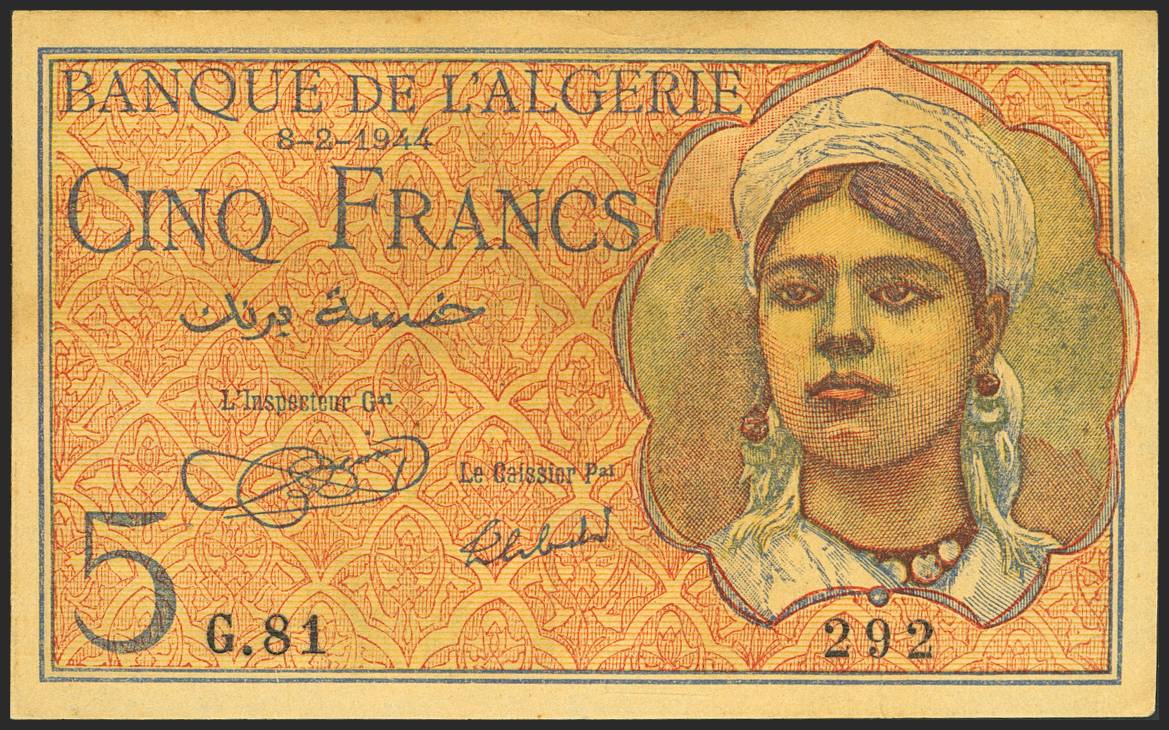 ALGERIA. 5 Francs. 8 February 1944. Banque de Algerie. (Pick: 94a). About Uncirculated.