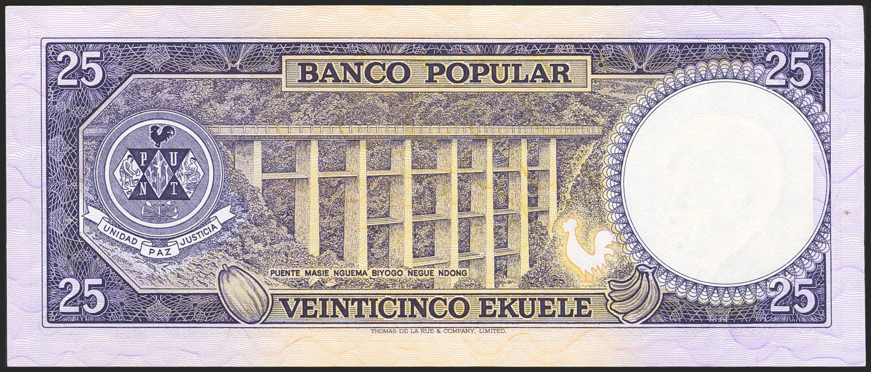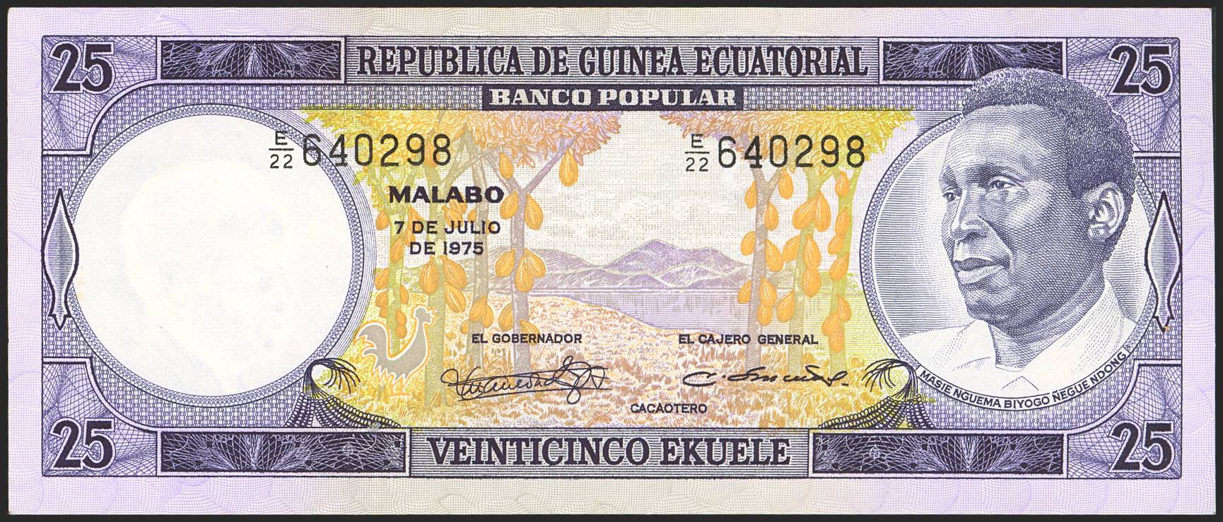 EQUATORIAL GUINEA. 25 Ekuele. 7 July 1975. Banco Popular. (Pick: 4). Uncirculated.