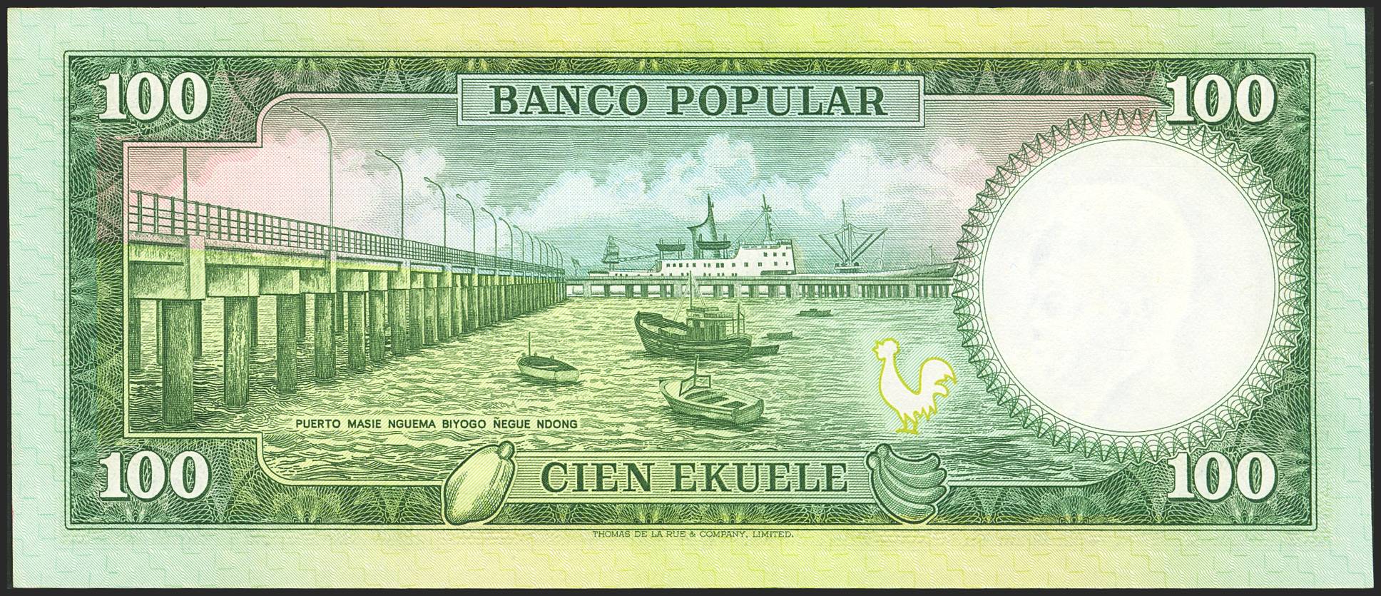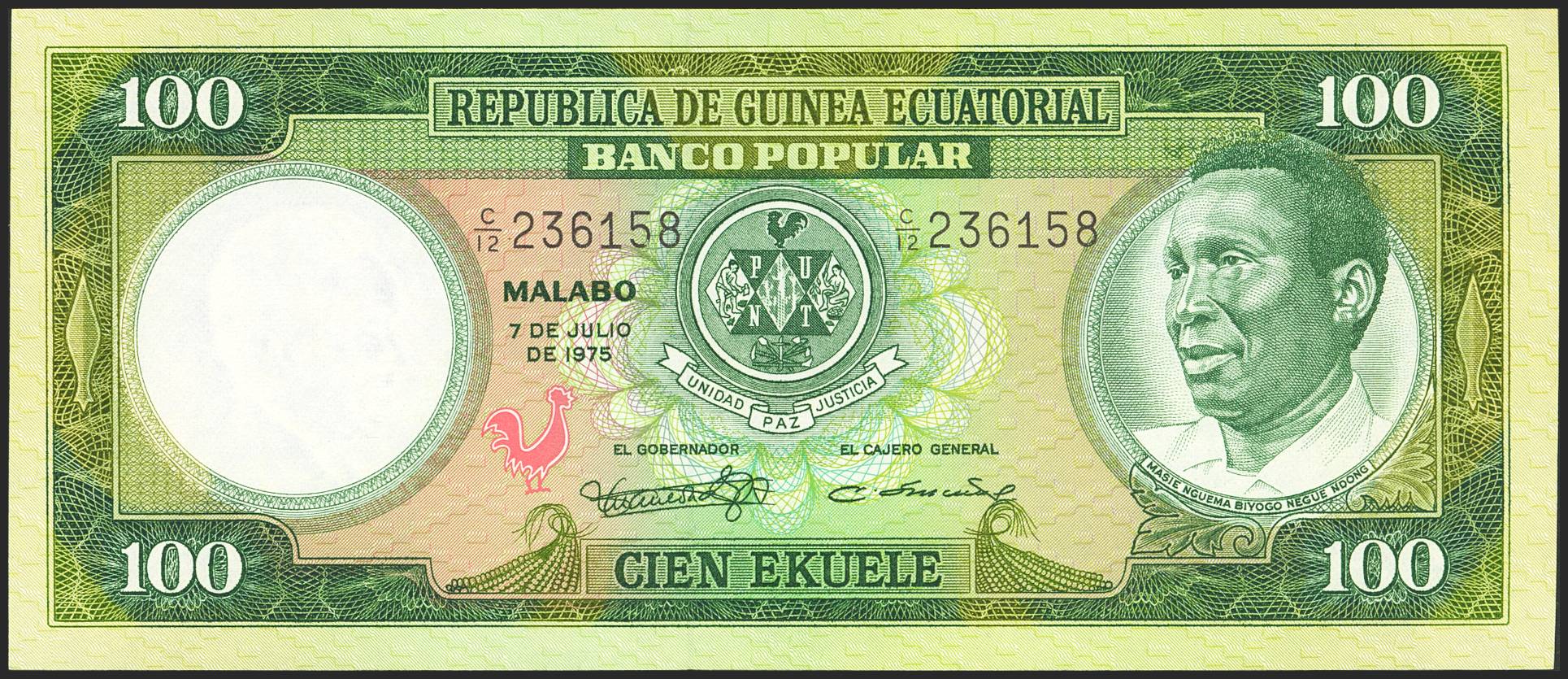 EQUATORIAL GUINEA. 100 Ekuele. 7 July 1975. Banco Popular. (Pick: 6). Less than Uncirculated.