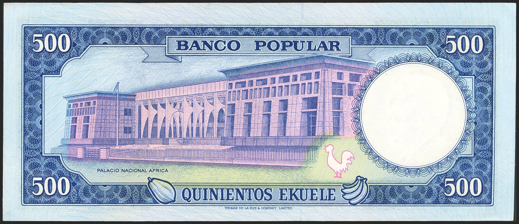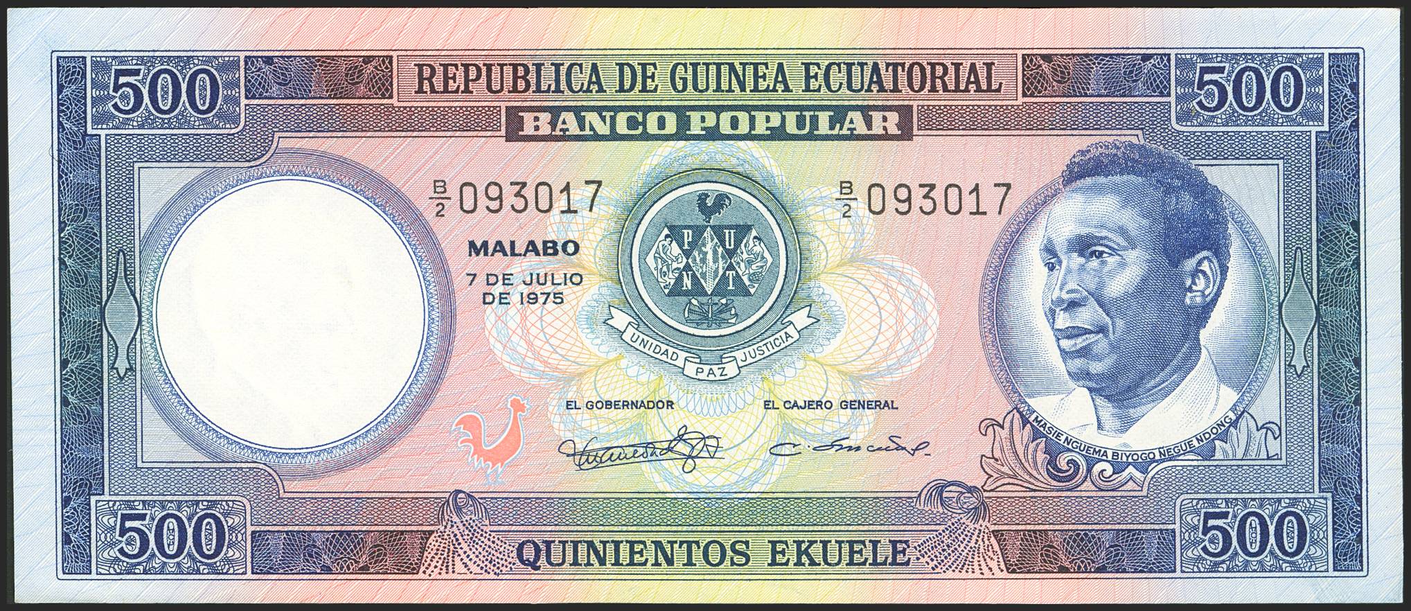 EQUATORIAL GUINEA. 500 Ekuele. 7 July 1975. Banco Popular. (Pick: 7). Less than Uncirculated.