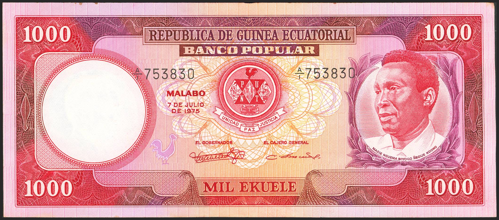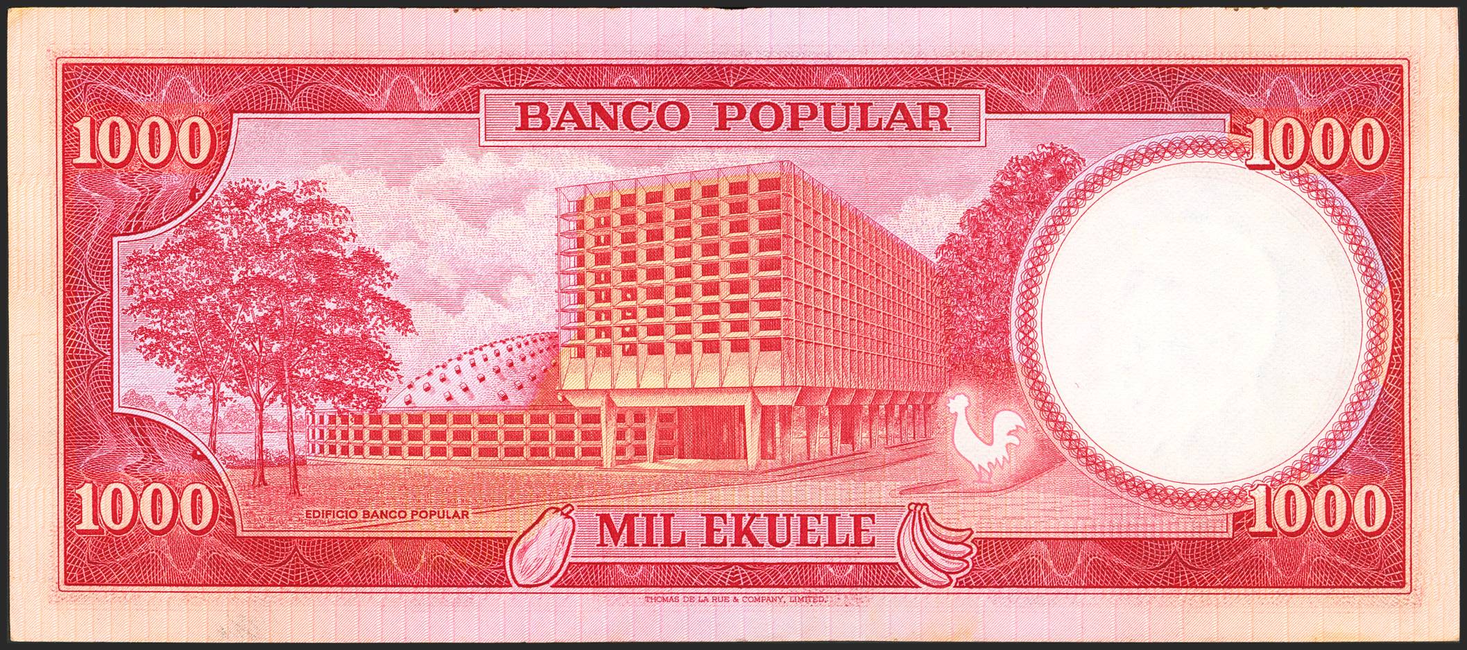 EQUATORIAL GUINEA. 1000 Ekuele. 7 July 1975. Banco Popular. (Pick: 8). Minor stains. Less than Uncirculated.