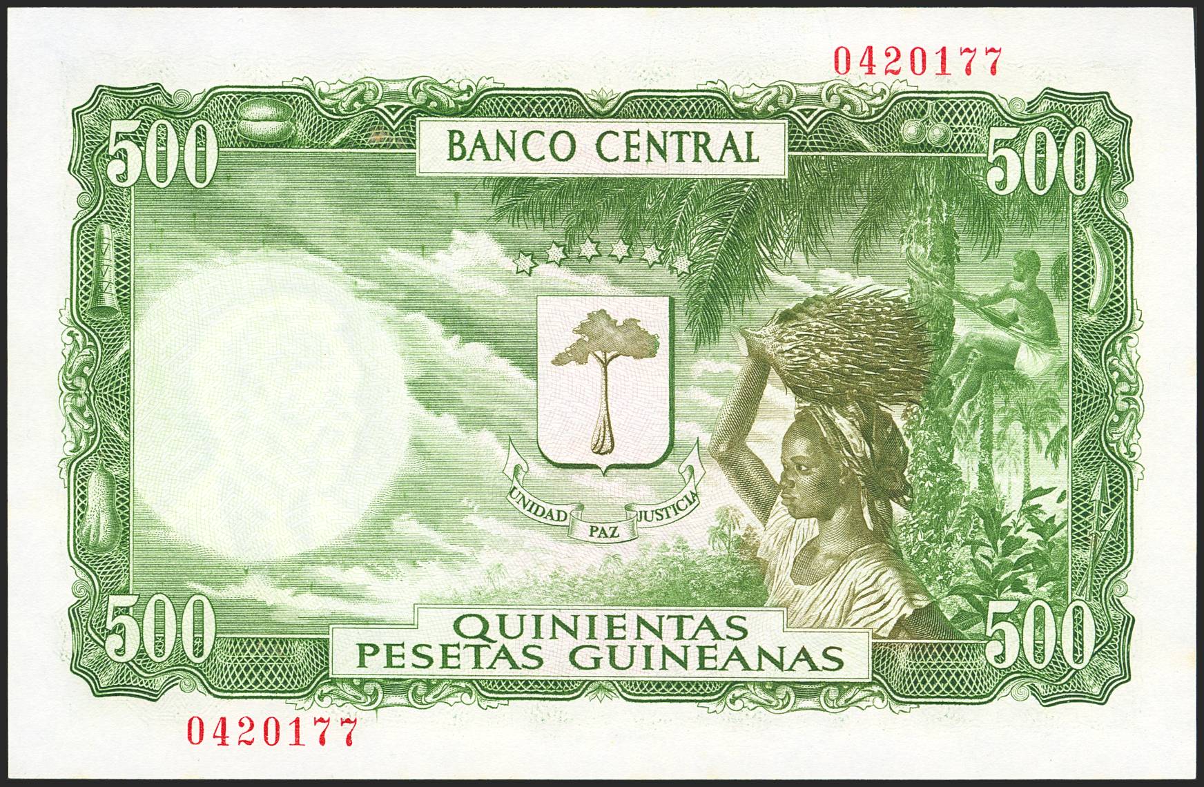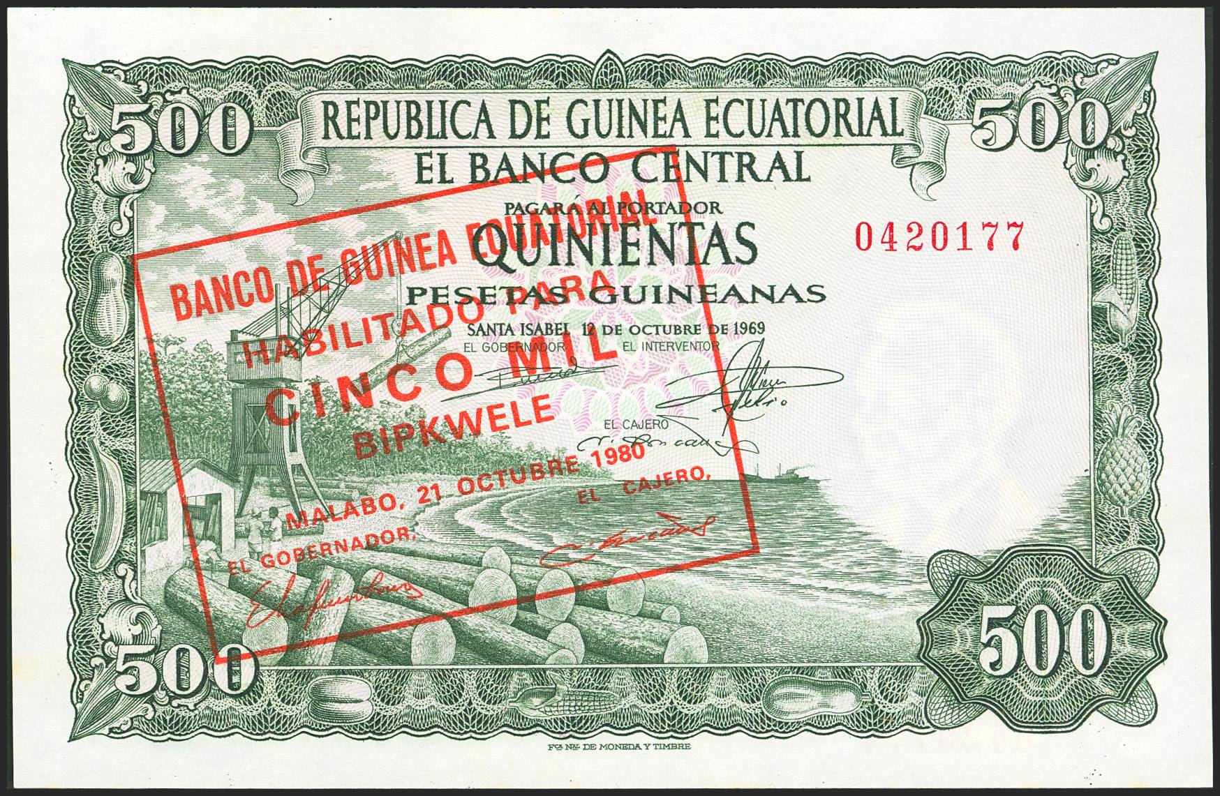 EQUATORIAL GUINEA. 5000 Bipkwele. 21 October 1980. Banco de Guinea Ecuatorial. (Pick: 19). Stains. Less than Uncirculated.