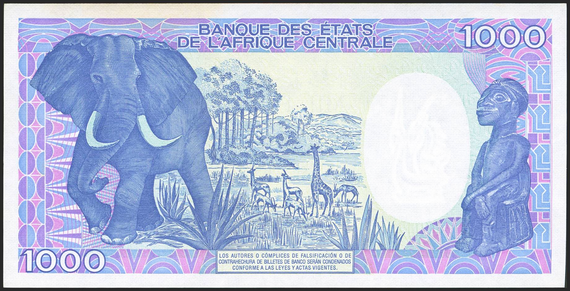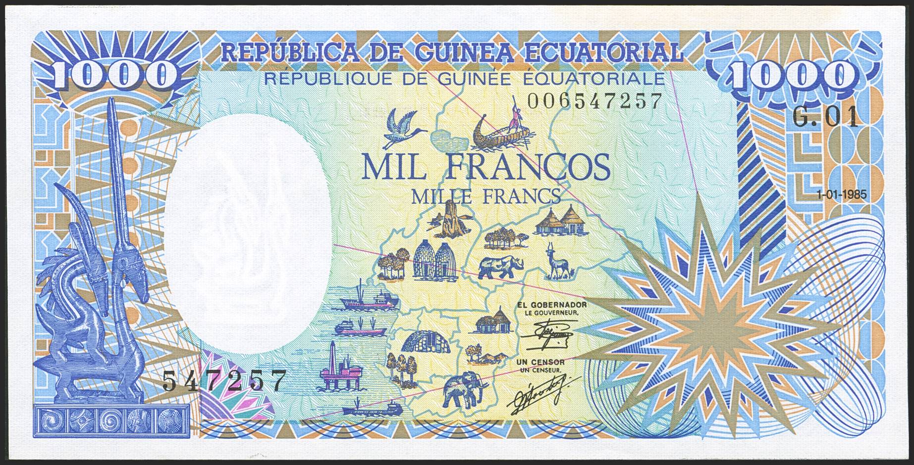 EQUATORIAL GUINEA. 1000 Francs. 1 January 1985. Republica de Guinea Ecuatorial. (Pick: 21). Stains. Less than Uncirculated.