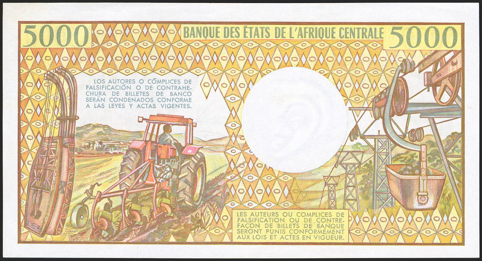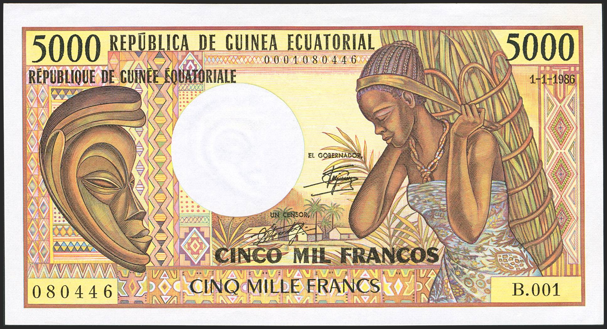 EQUATORIAL GUINEA. 5000 Francs. 1 January 1986. Republica de Guinea Ecuatorial. (Pick: 22b). Rare in this quality. Less than Uncirculated. PMG SI.