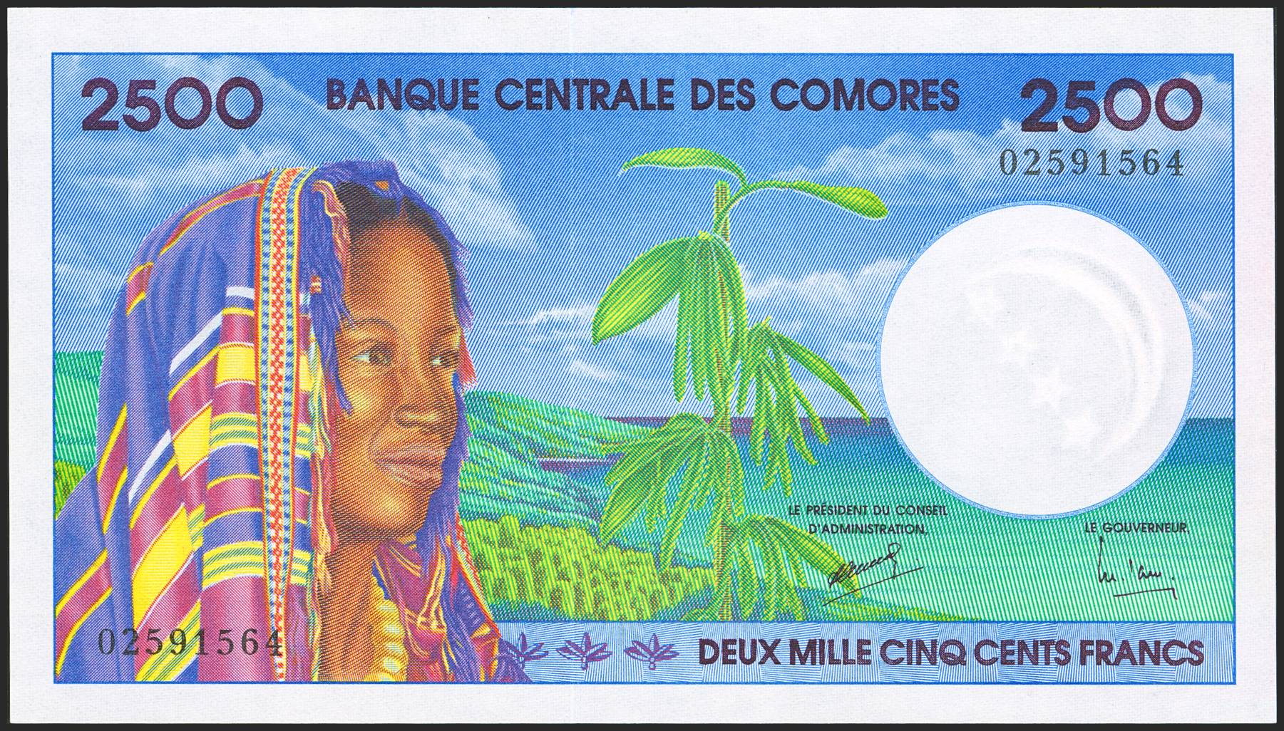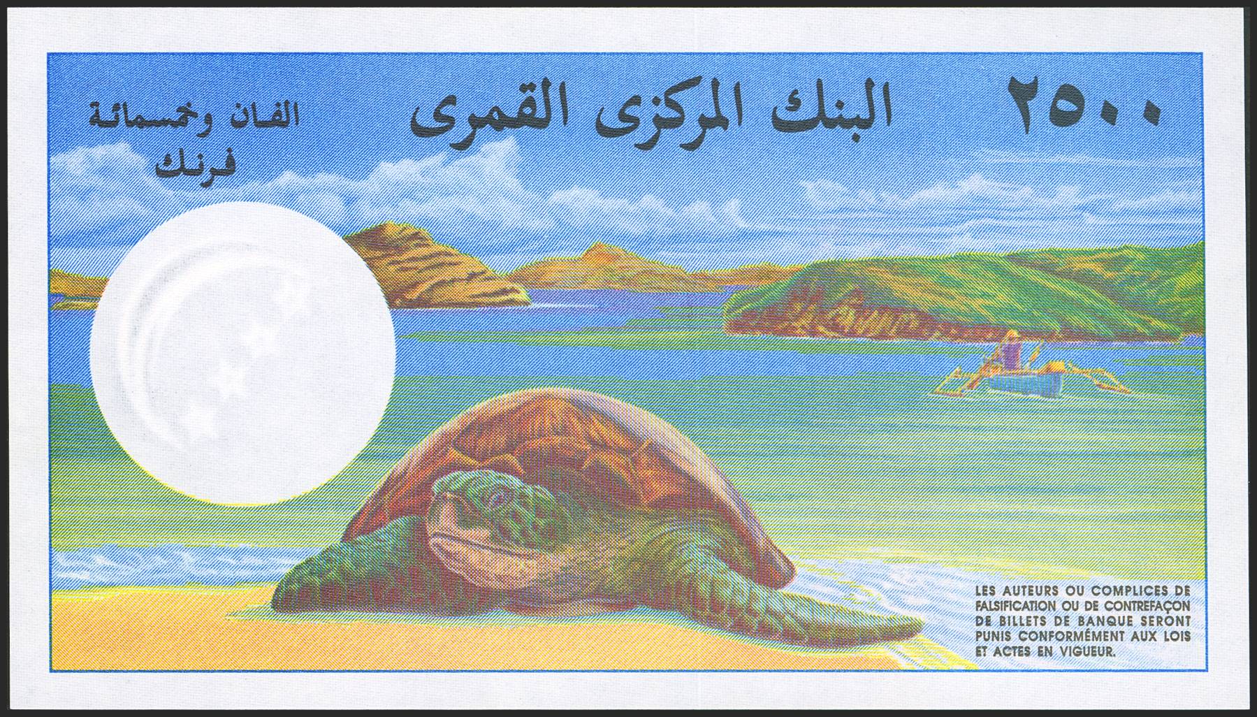 COMOROS. 2500 Francs. (1997ca). Central Bank. (Pick: 13). Rare in this quality. Uncirculated.