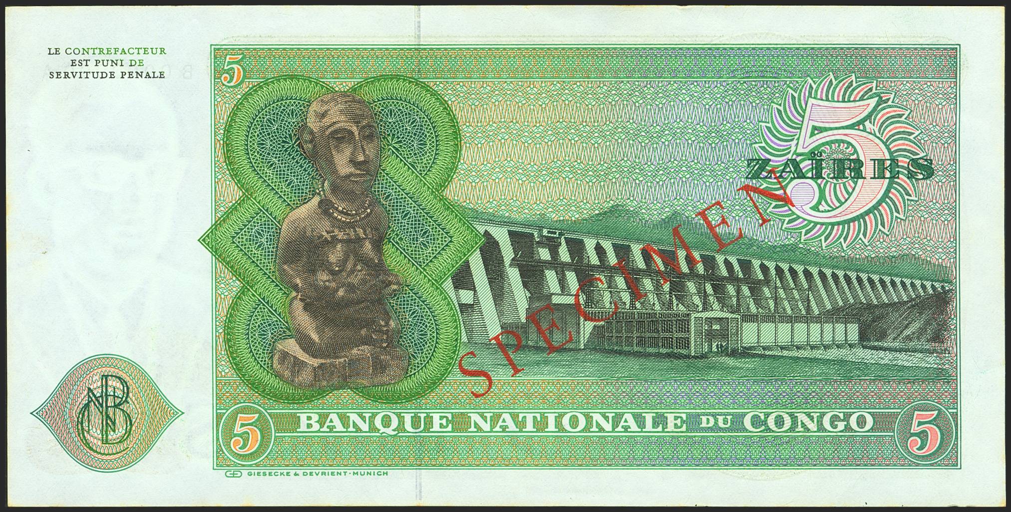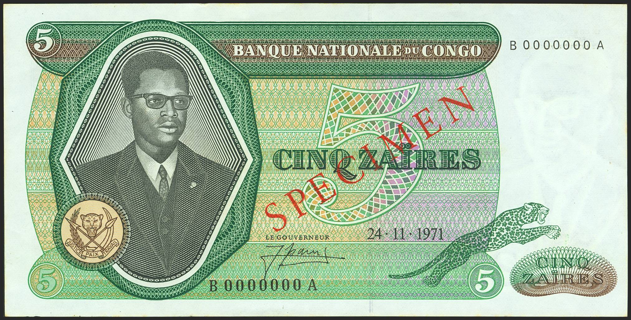 CONGO DEMOCRATIC REPUBLIC. 5 Zaires. 24 November 1971. SPECIMEN and numeration B0000000A. Bank Nationale. (Pick: 14s). Minor stains. Less than Uncirculated.