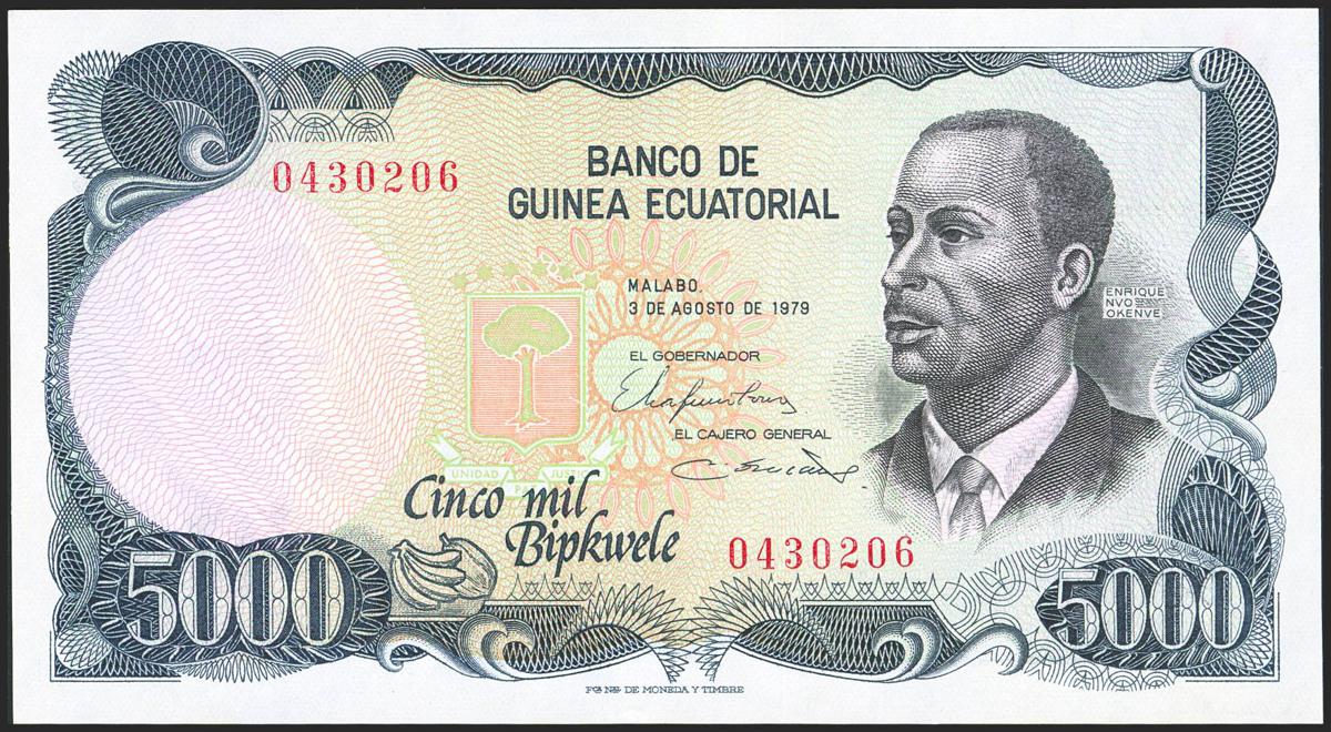 EQUATORIAL GUINEA. 5000 Bipkwele. 21 October 1980. Banco de Guinea Ecuatorial. (Pick: 19). Stains. Less than Uncirculated.