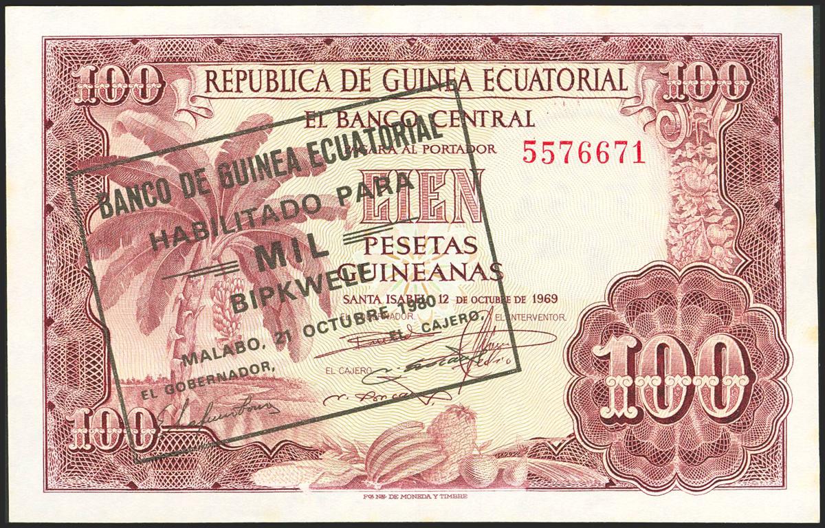EQUATORIAL GUINEA. 1000 Bipkwele. 21 October 1980. Banco de Guinea Ecuatorial. (Pick: 18). Stains. Less than Uncirculated.