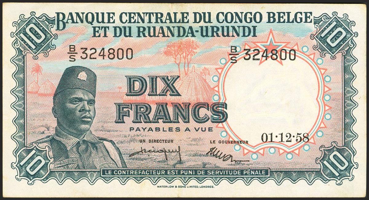 BELGIAN CONGO. 10 Francs. 1 December 1958. Central Bank. (Pick: 30). More than Very Fine.