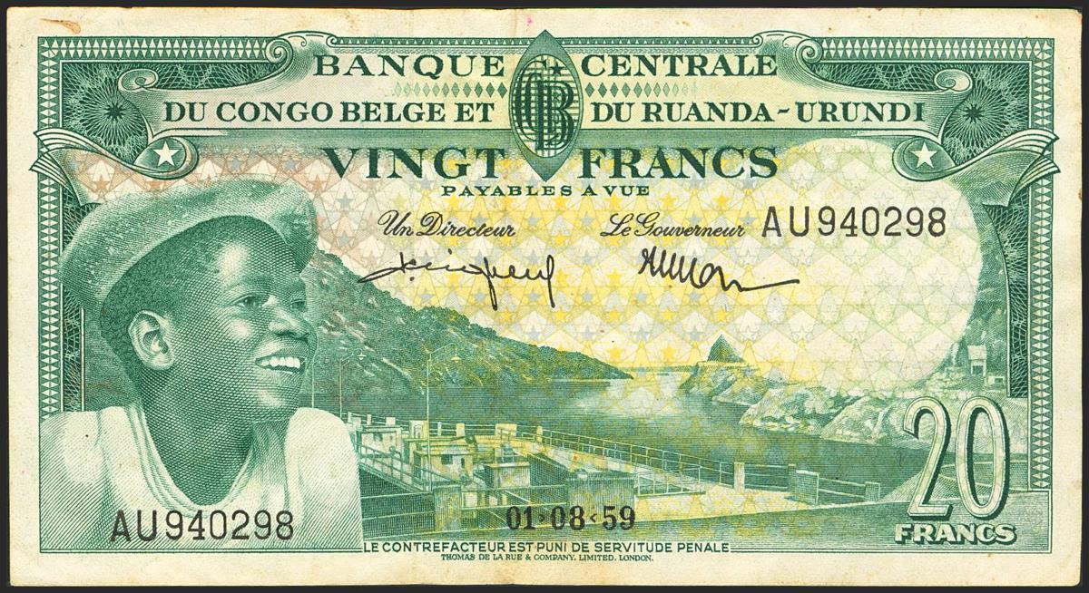 BELGIAN CONGO. 20 Francs. 1 August 1959. Central Bank. (Pick: 31). Very Fine.