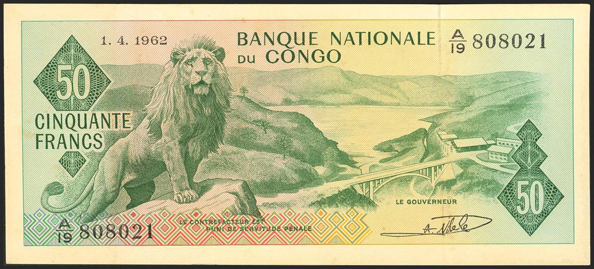 CONGO DEMOCRATIC REPUBLIC. 50 Francs. 1 April 1962. Bank Nationale. (Pick: 5a). Stains. About Uncirculated.