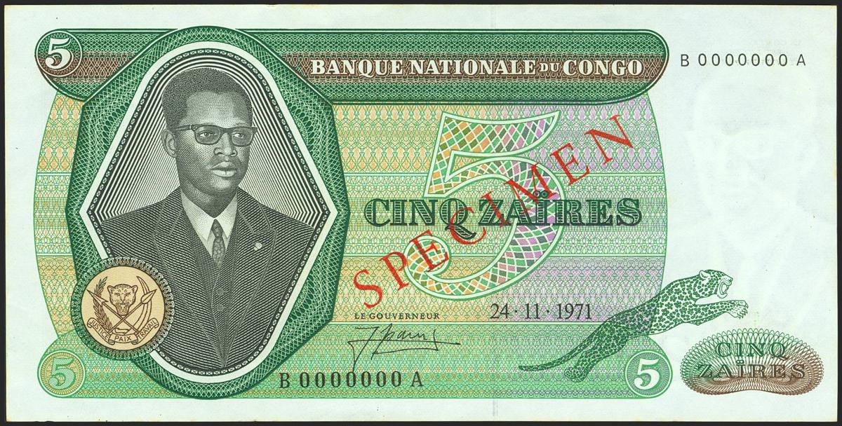 CONGO DEMOCRATIC REPUBLIC. 5 Zaires. 24 November 1971. SPECIMEN and numeration B0000000A. Bank Nationale. (Pick: 14s). Minor stains. Less than Uncirculated.