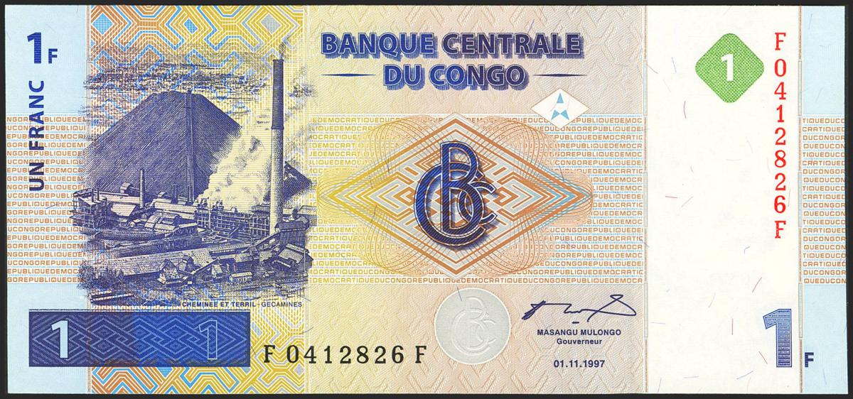 CONGO DEMOCRATIC REPUBLIC. 1 Franc. 1 November 1997. Central Bank. (Pick: 85). Uncirculated.