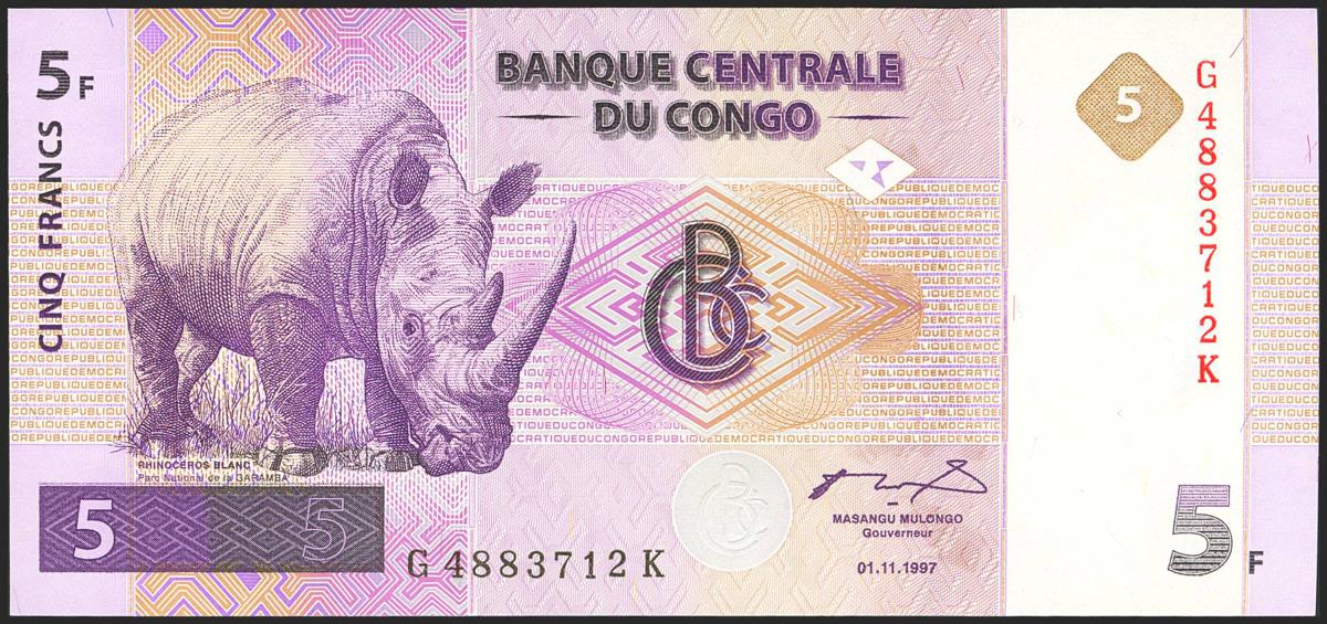 CONGO DEMOCRATIC REPUBLIC. 5 Francs. 1 November 1997. Central Bank. (Pick: 86A). Uncirculated.
